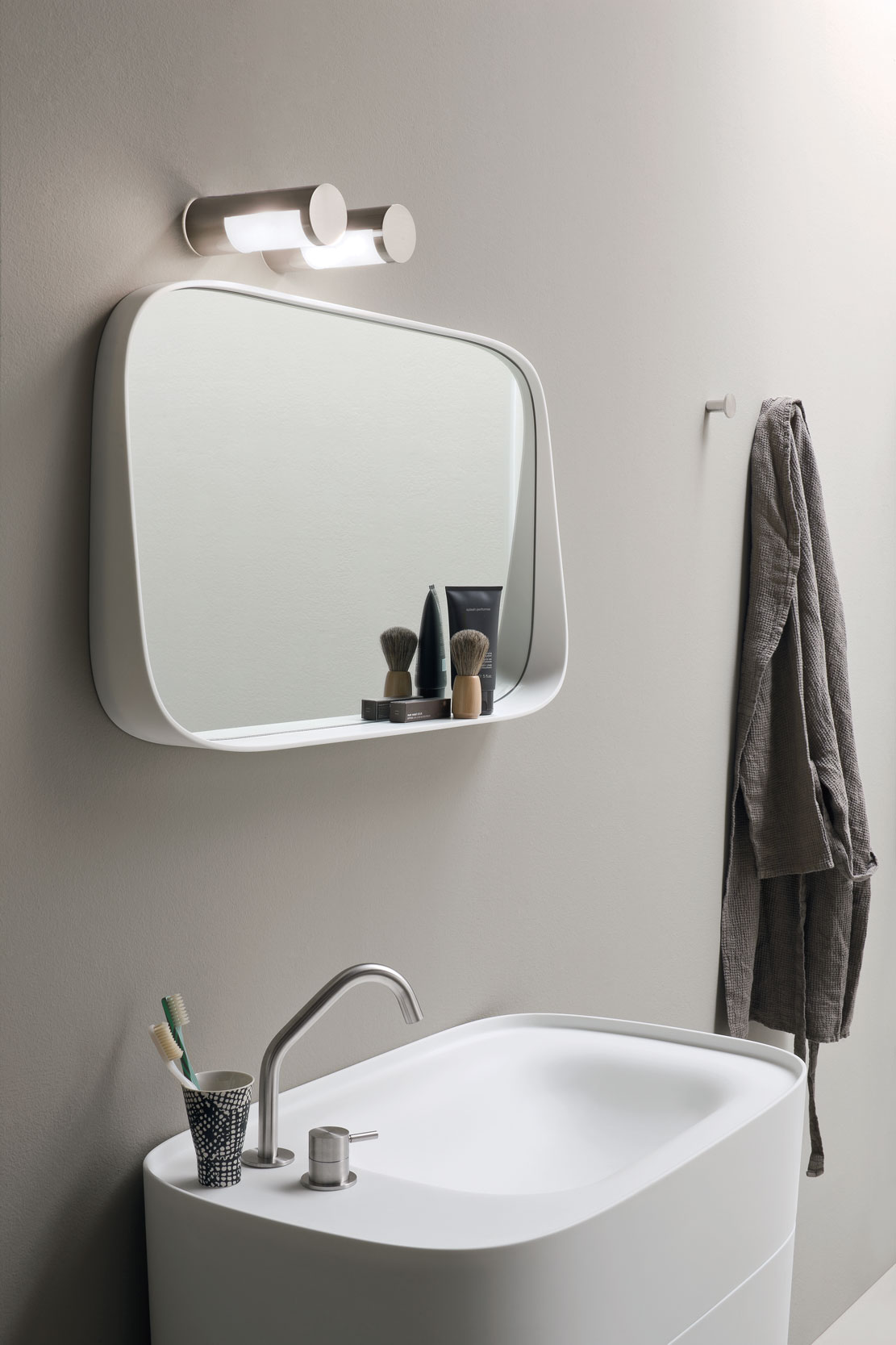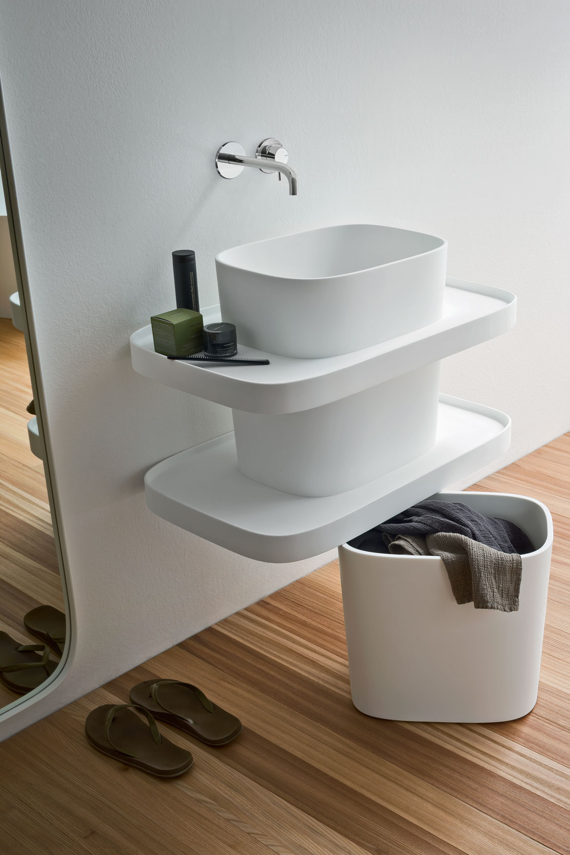 Una collezione che nasce dalla ricerca della cultura giapponese e mette in luce l’essenza rituale del benessere, dando valore al tempo e allo spazio. Un sistema di panche personalizzabili con accessori e lavabi in appoggio, sostituisce il più tradizionale mobile da bagno. Volumi morbidi e linee curve contengono a vista, consentendo di esporre in modo naturale gli oggetti del quotidiano, come spazzole, saponi e salviette, rispettando ogni abitudine.