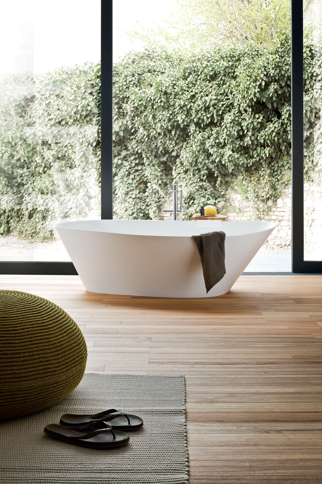 Tra gli elementi protagonisti della collezione Fonte ci sono oggetti pensati per scandire funzioni specifiche conservando allo stesso tempo l’aspetto suggestivo che parla della cultura orientale. Tra loro lo sgabello in legno con la ciotola in Corian che funge da bacinella per il pediluvio, oppure diventa elemento d’appoggio da utilizzare in accosto alla vasca.