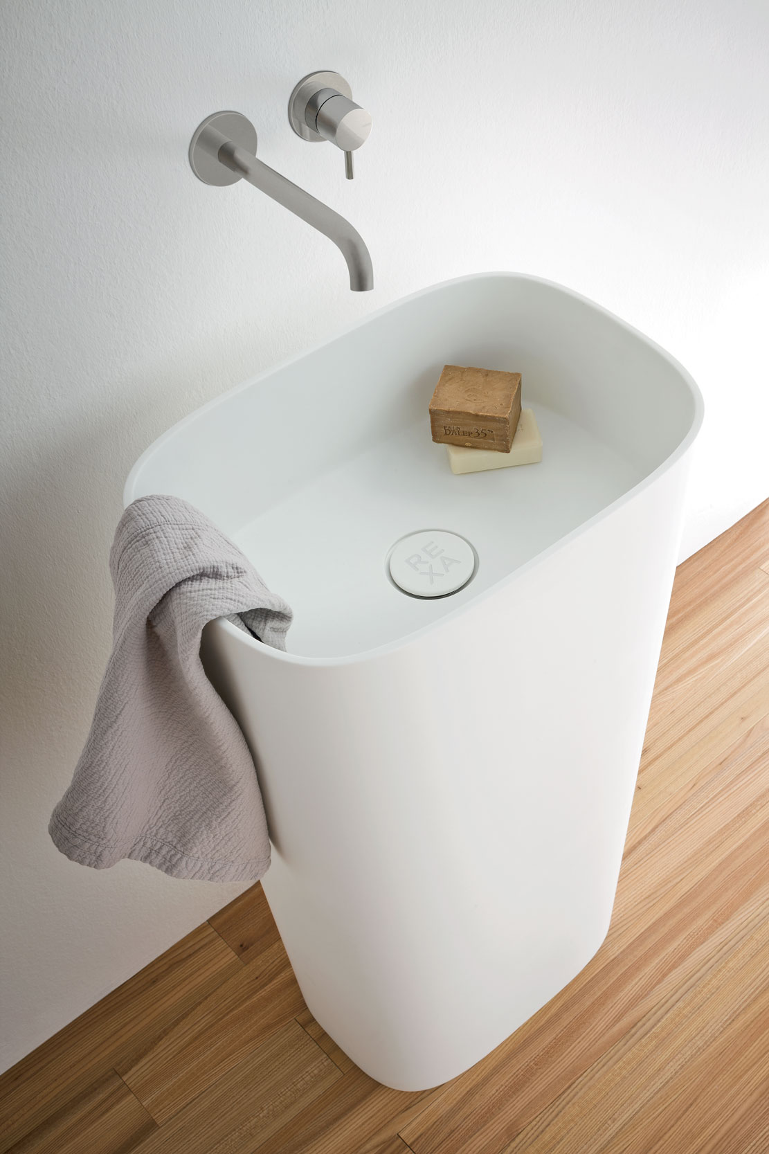 Fonte rivisita l’approccio orientale e il concetto di una stanza dedicata alla cura della persona come uno spazio da condividere con la famiglia. La forma del lavabo si ispira alla filosofia del “secchio catino” e alla sua centralità nella vita rurale. Gli elementi iconici dalle forme morbide presenti in questo ambiente creano un’atmosfera rilassante e diventano gli unici protagonisti dello spazio. Questa semplicità si riflette anche nella scelta dei materiali dedicati: Corian® bianco e legno chiaro.