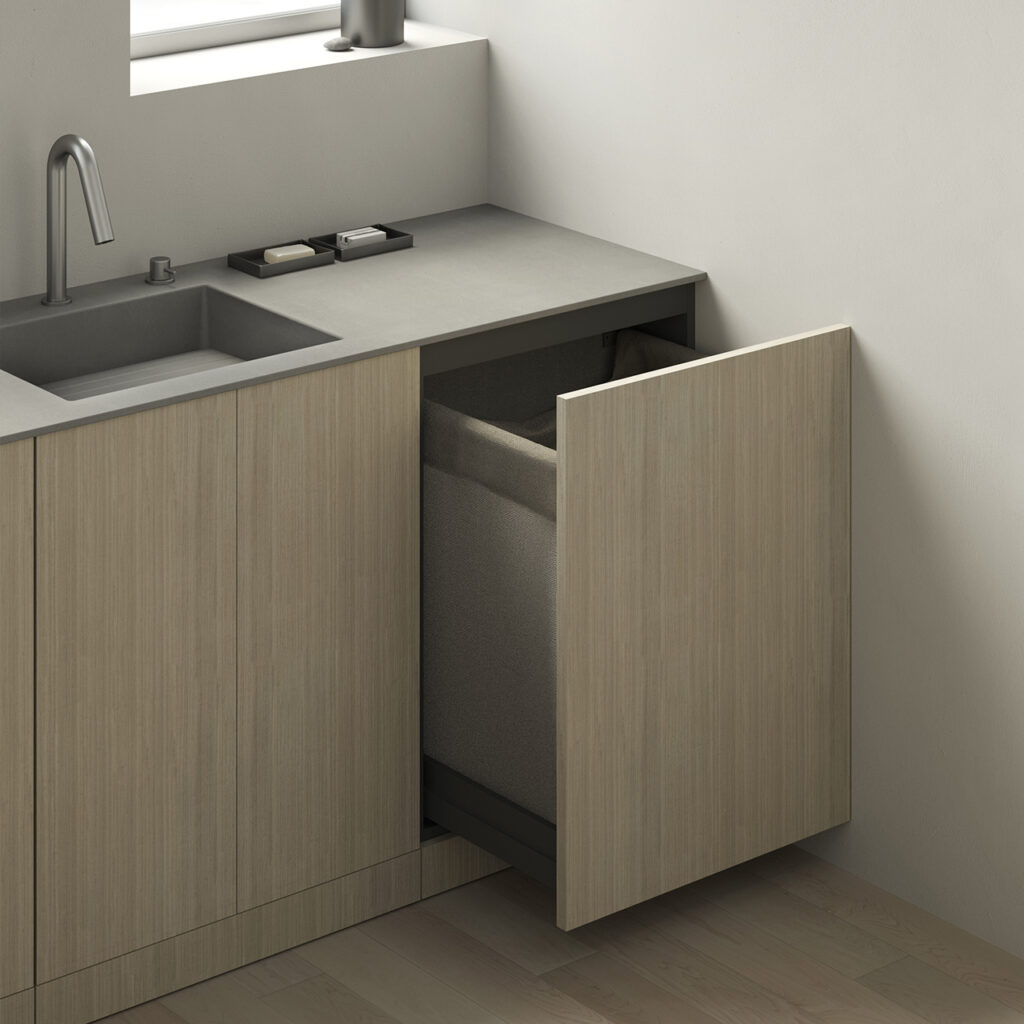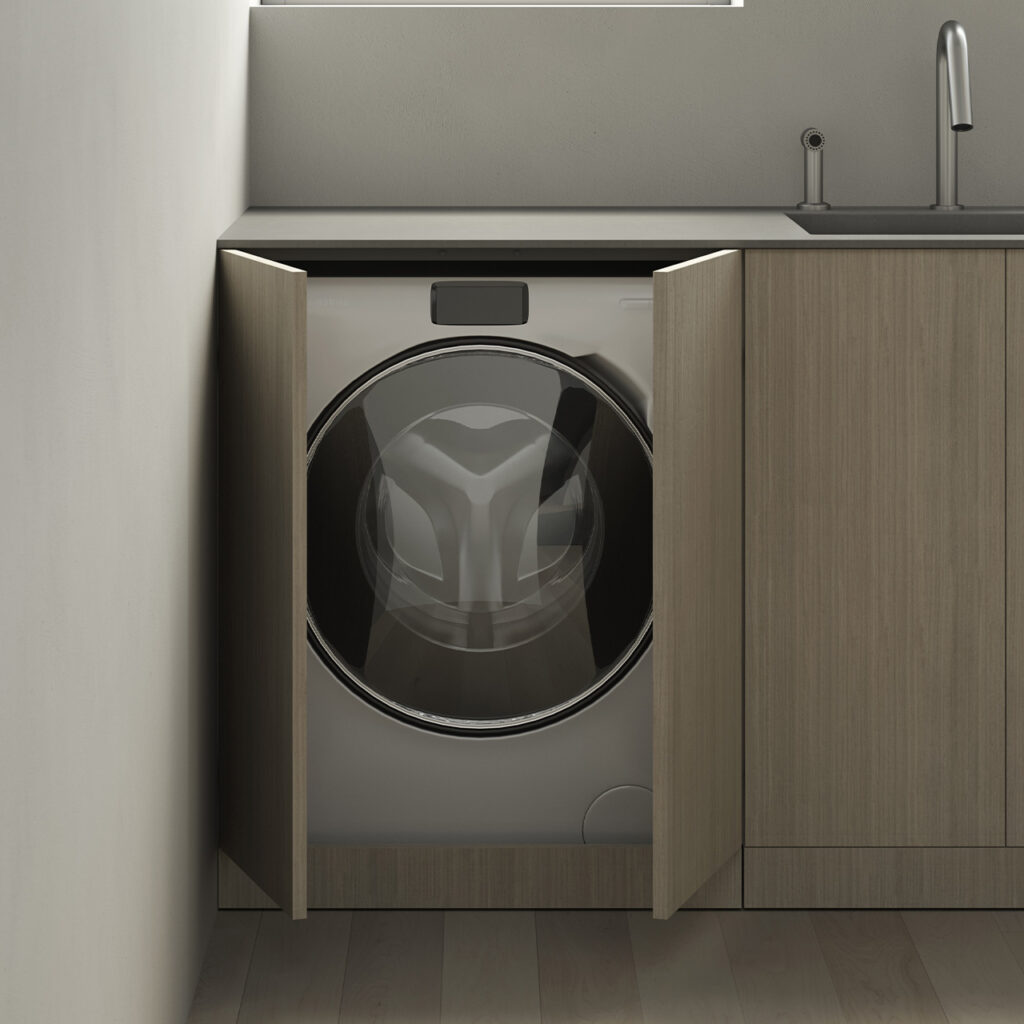 Soluzioni modulari armoniche che si estendono anche alla lavanderia grazie a spaziose colonne e basi di profondità dedicata che possono contenere vani, elettrodomestici, portabiancheria o lavabi dedicati garantendo continuità progettuale all’insegna dell’eleganza.