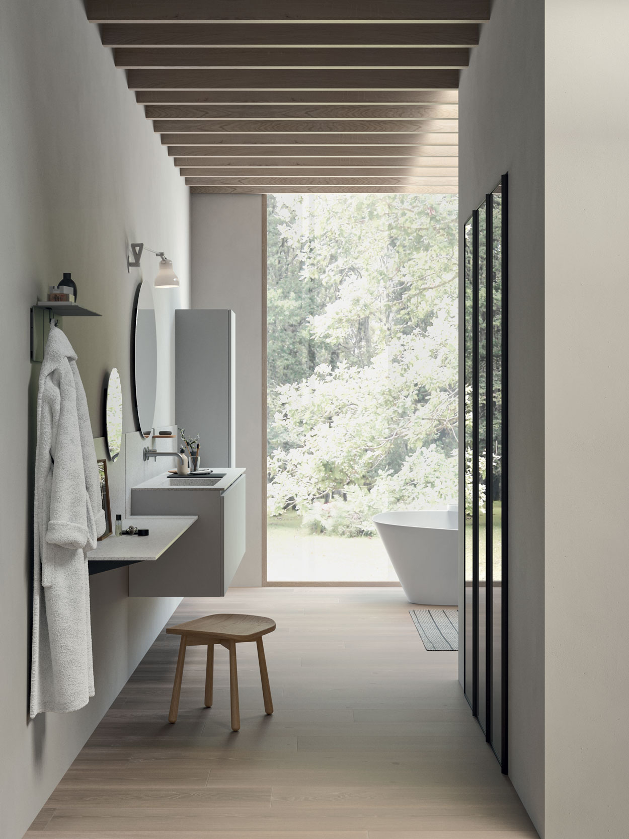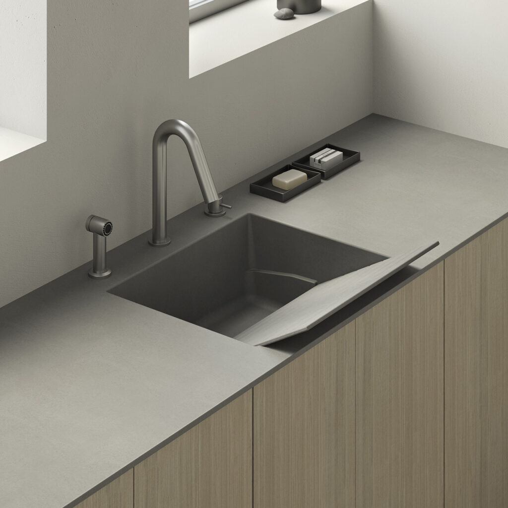 Come un intermezzo, gli accessori leggeri si alternano ai pieni dei mobili e ad alzate sospese che avvolgono il mobile diventando delle piccole pause nella continuità del top, per un effetto visivo sorprendentemente leggero e armonioso.