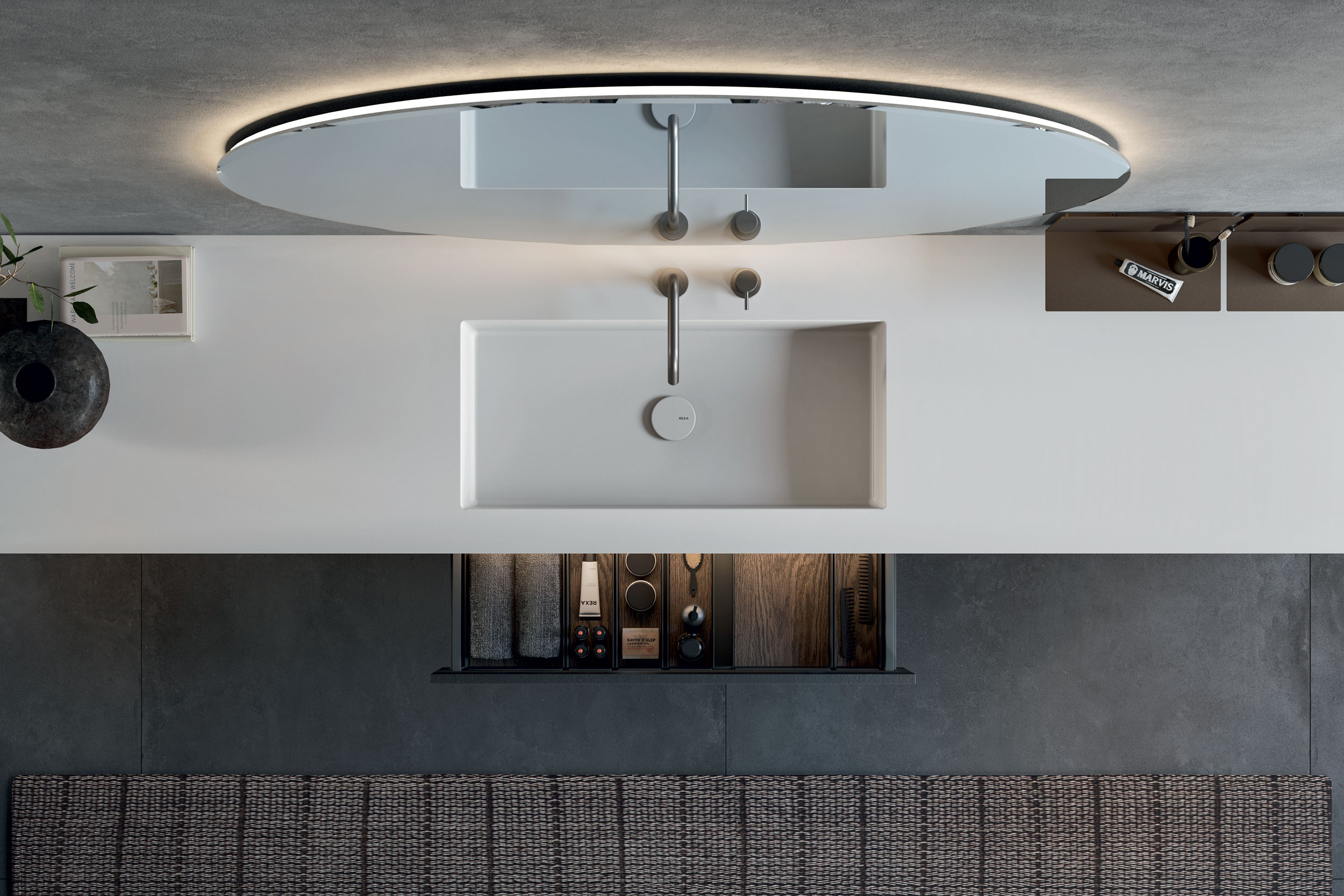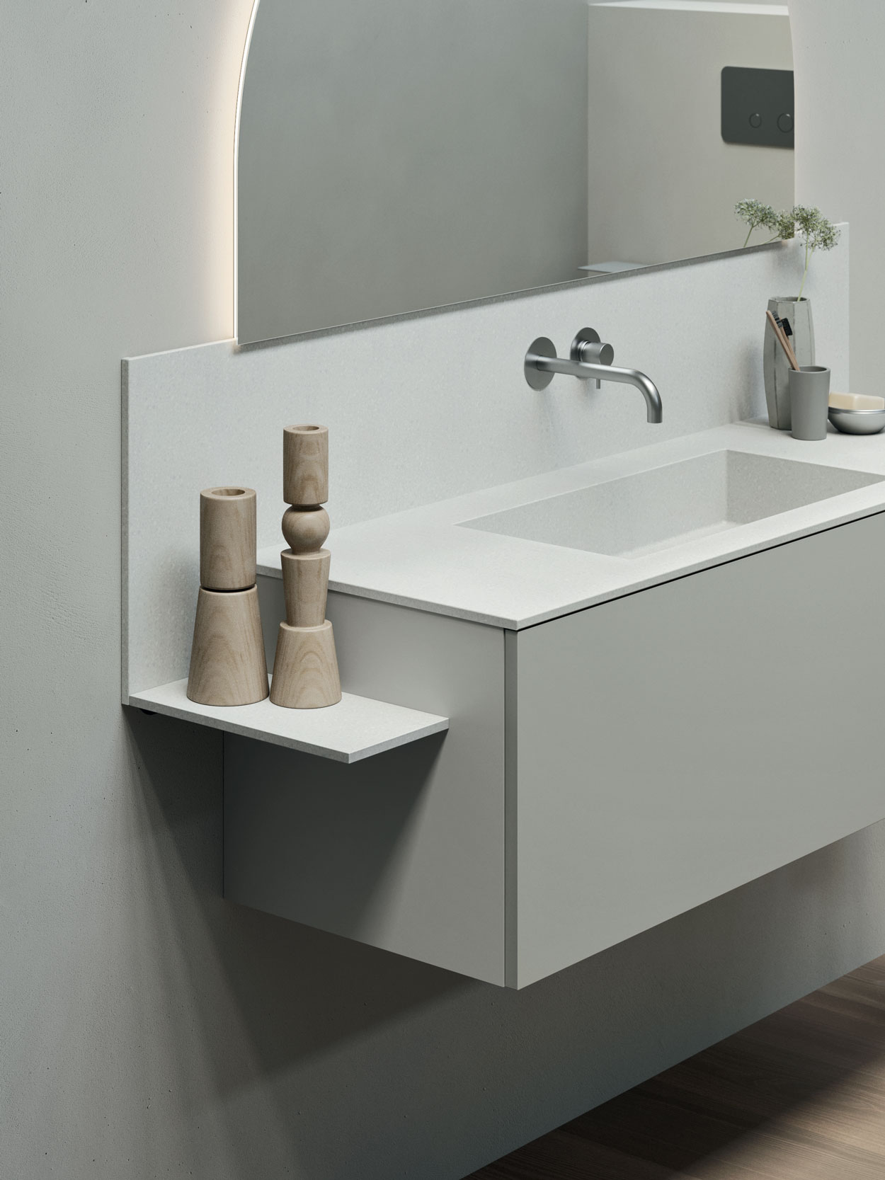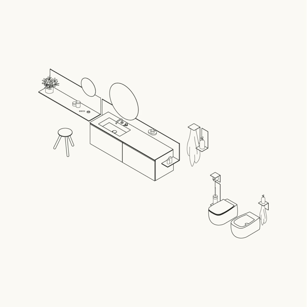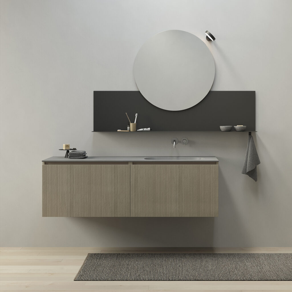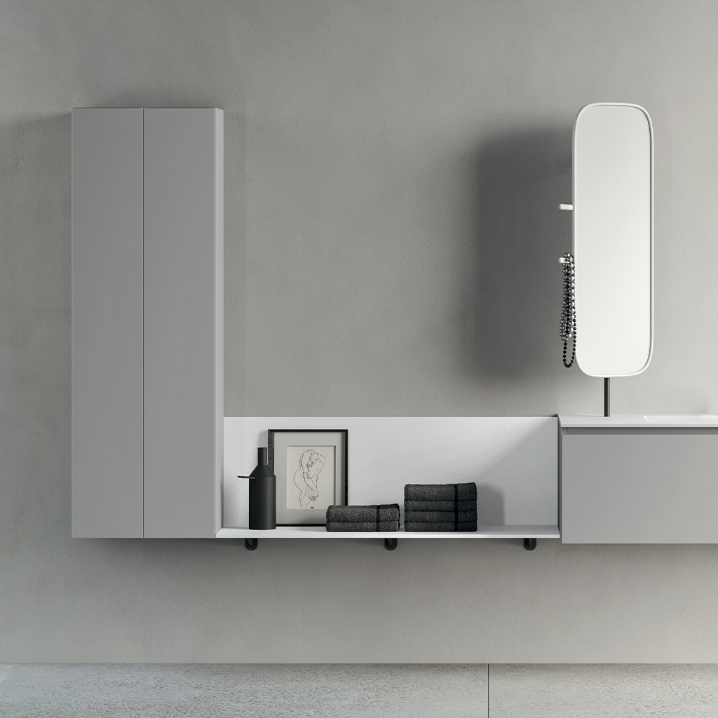 Una composizione d’arredo destinata ai riti di bellezza in relax, da seduti, disponibile in diverse lunghezze, da 80 a 160 centimetri per ospitare tutto il necessario per la propria routine.