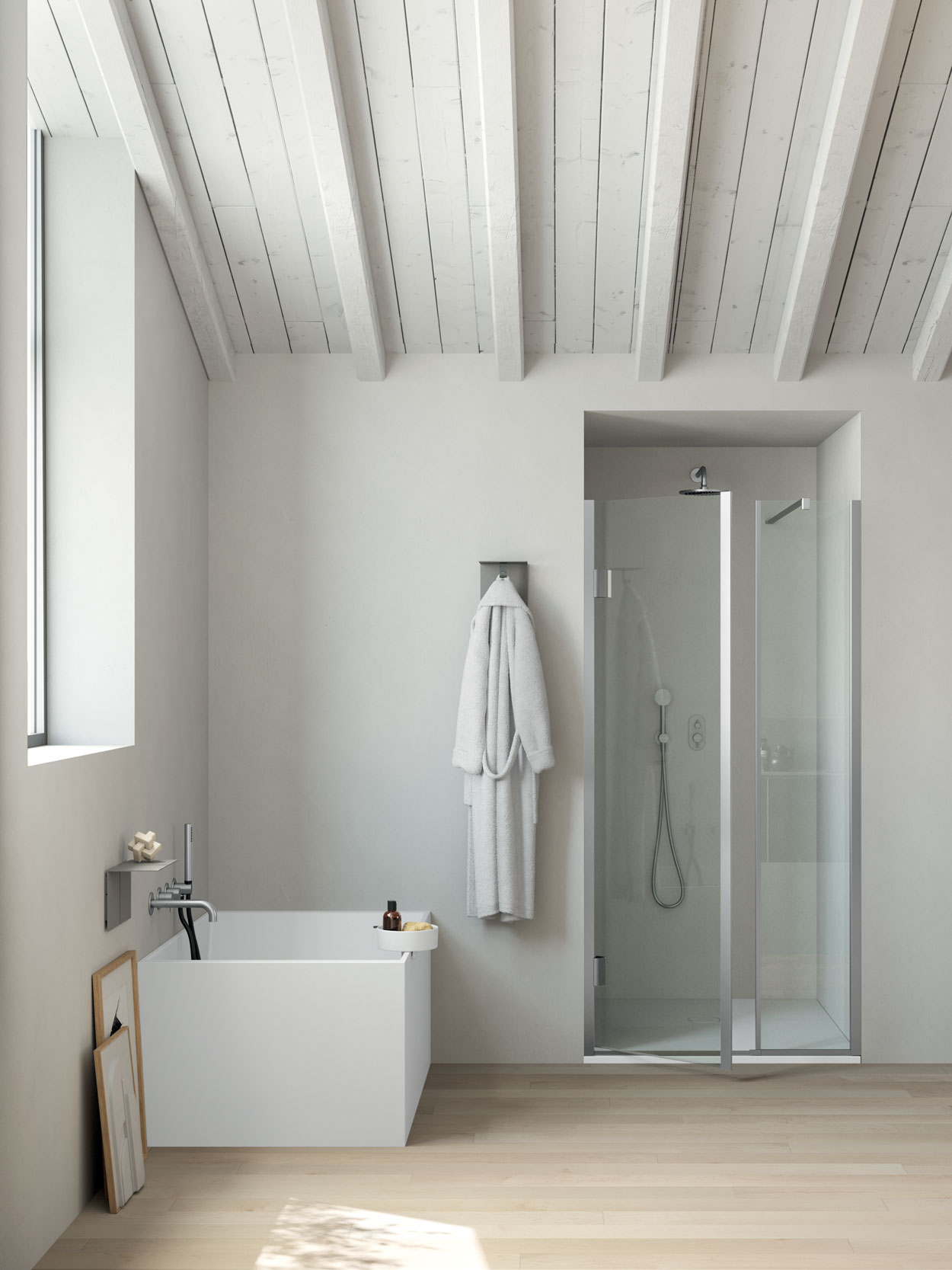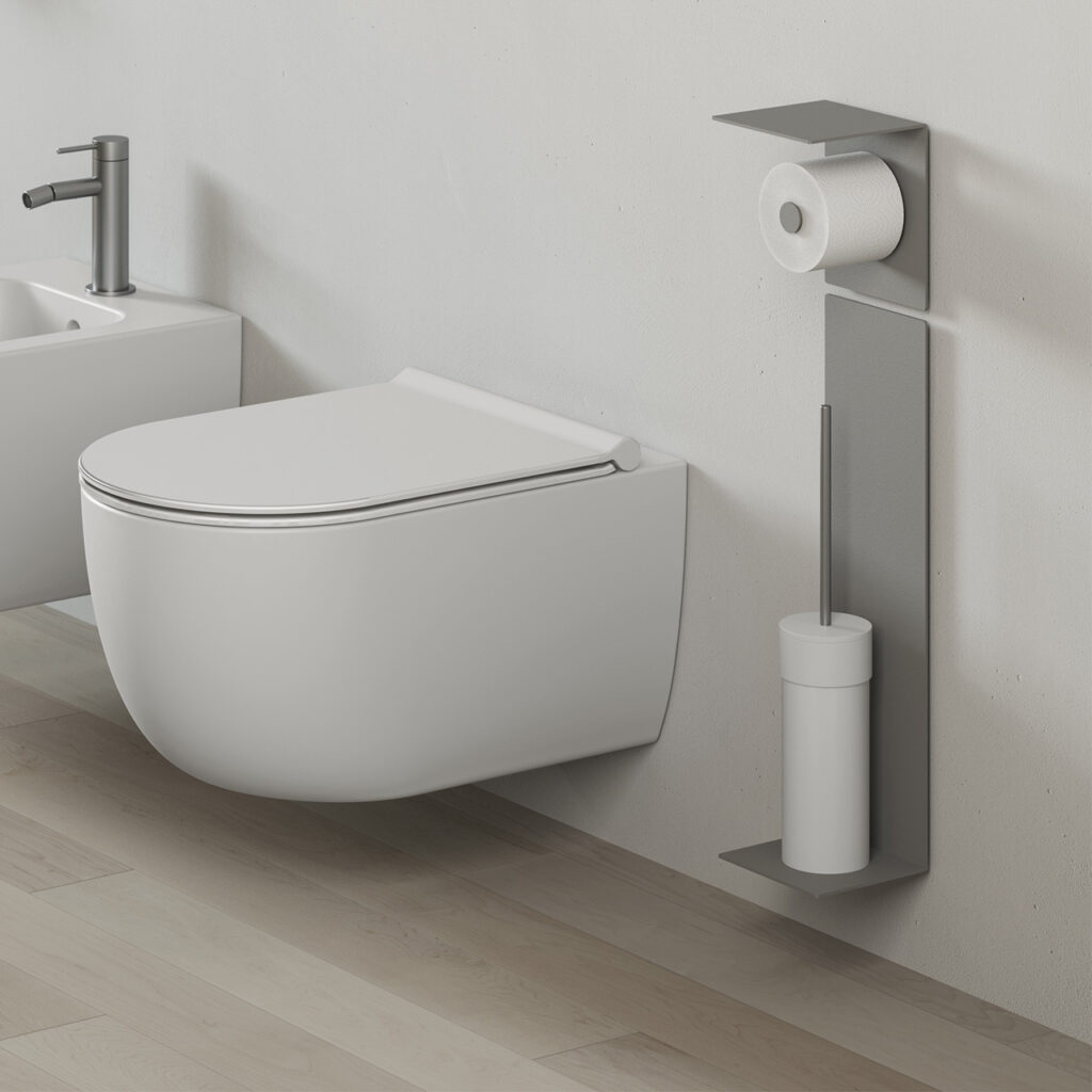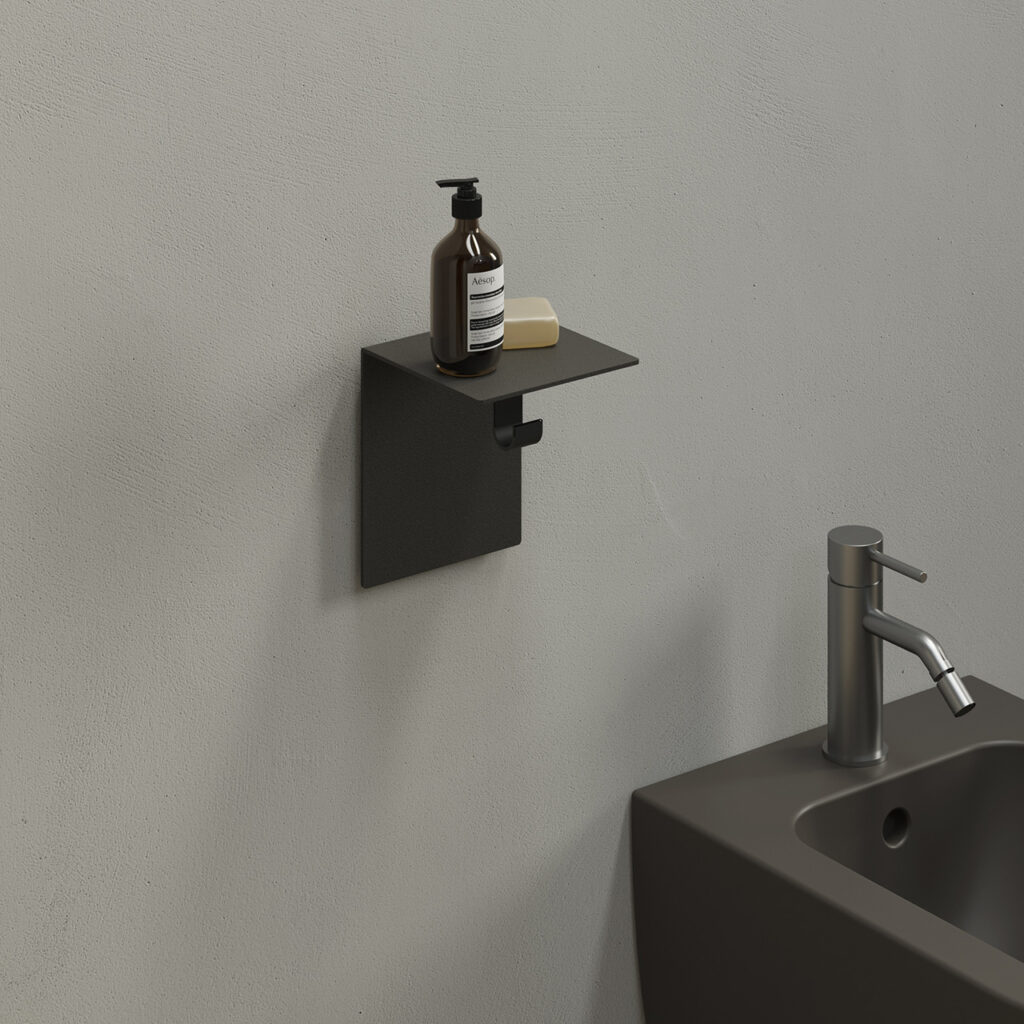 Elementi versatili caratterizzanti ad “L”, come mensole ancorate al muro combinate a ganci appendiabito o complementi porta rotolo e porta scopino, sono realizzati in lamiera.