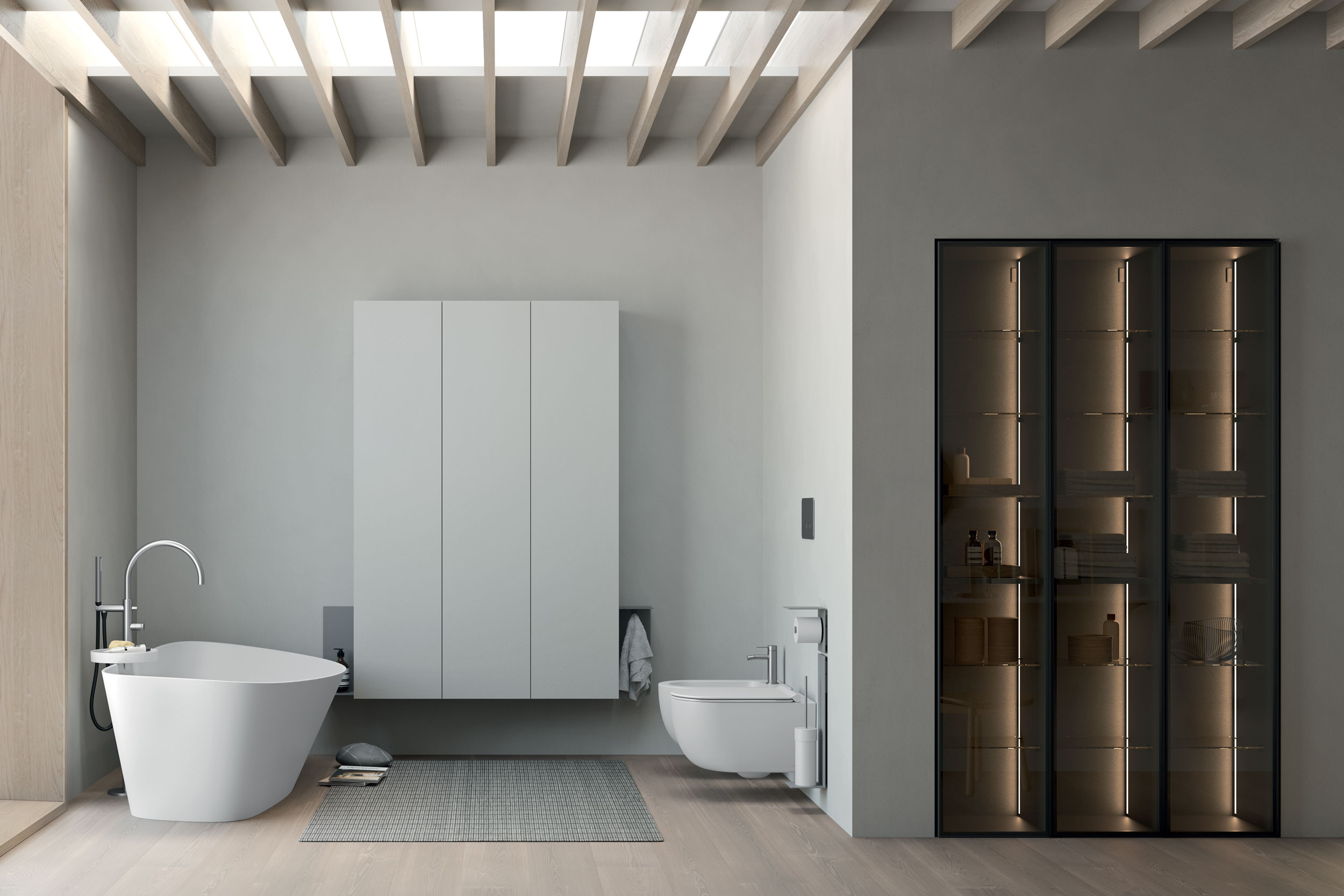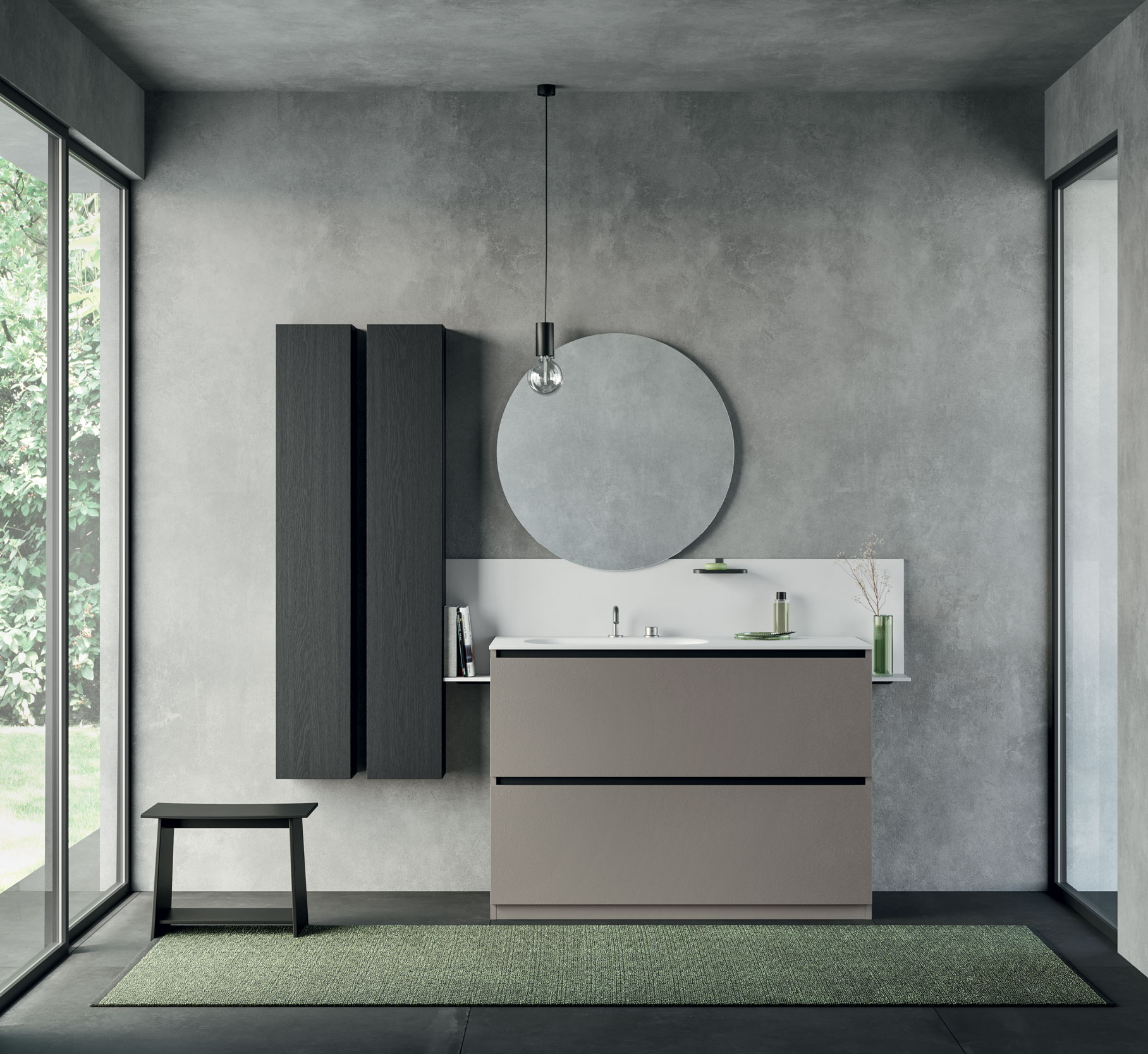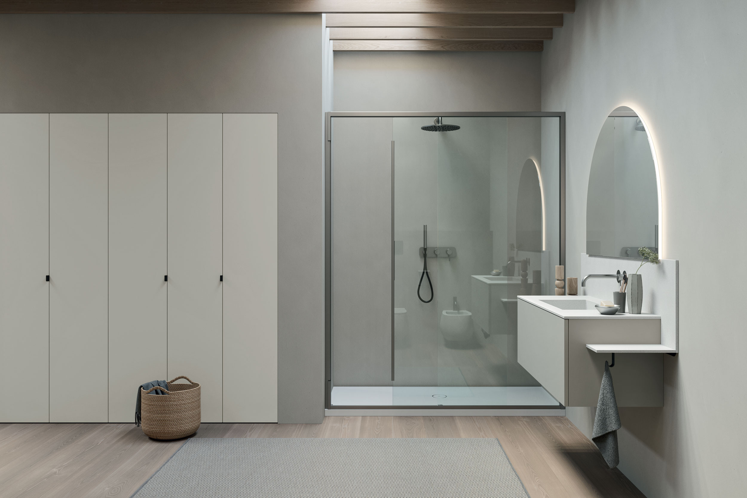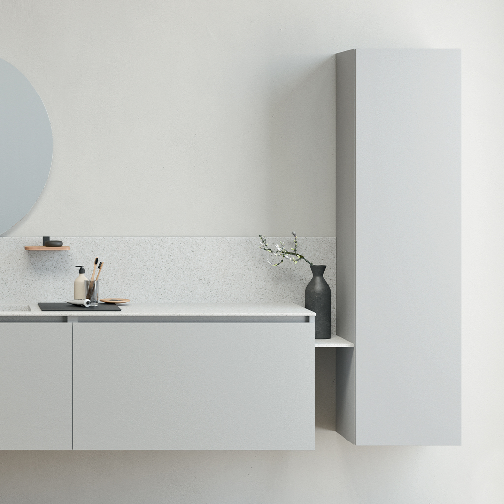 Push-pull, gola e 3 tipologie di maniglia completano basi di diverse altezze e 3 profondità (36, 46, o 53 centimetri) a cui si aggiungono colonne e pensili, vetrine, alzatine, consolle trucco, mensole, appendini e accessori che migliorano contenimento e organizzazione.