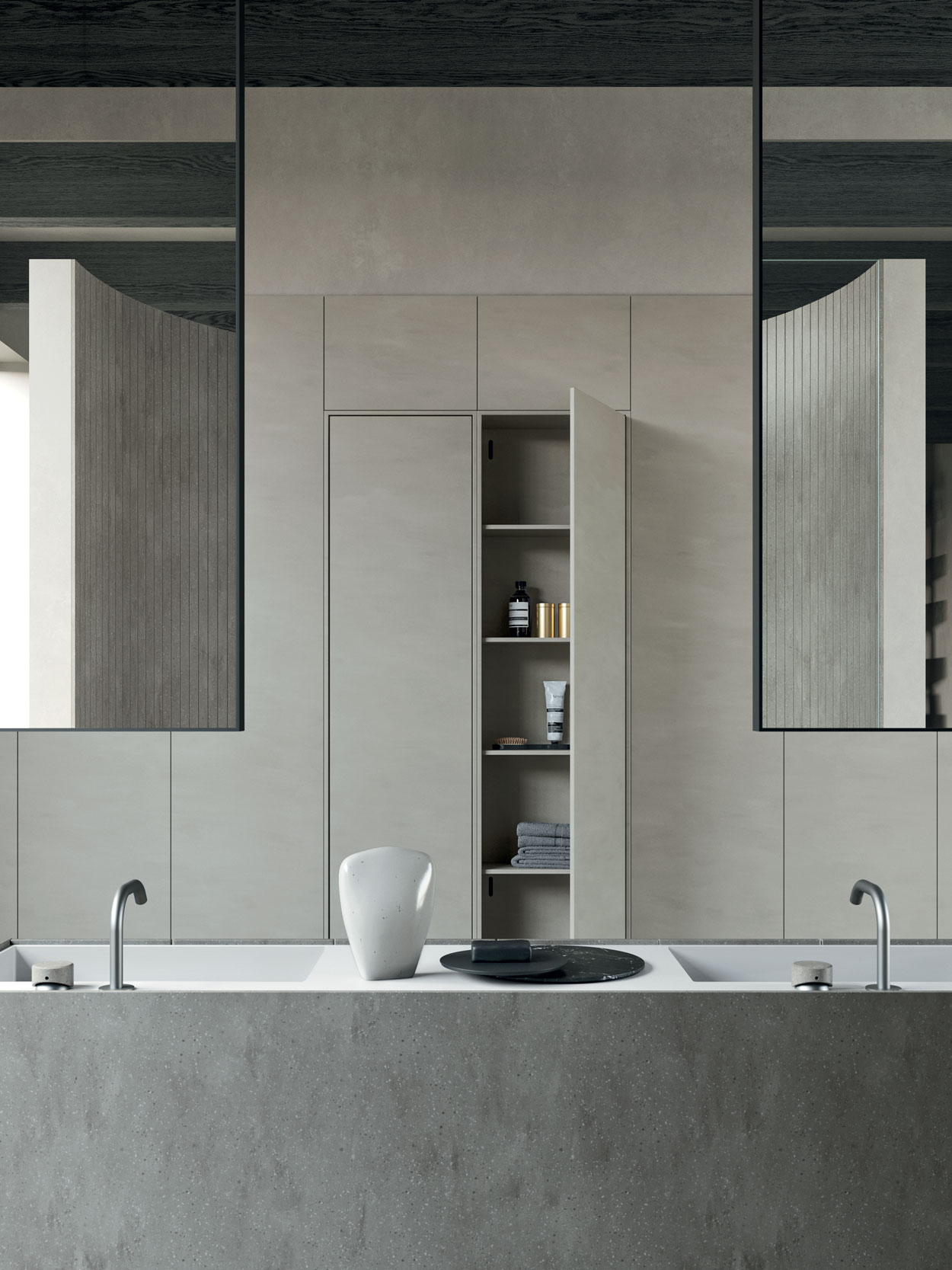 Le volumetrie essenziali e flessibili della collezione si adattano a ogni elemento e funzione, completando lo spazio bagno con tutti i colori di Corian® pensati per i mobili e gli altri elementi, estesi anche ai rivestimenti. Le scanalature di diverse dimensioni consentono di creare contrasti d'impatto o di mantenere una continuità visiva con gli altri arredi della stanza, generando un ambiente uniforme e armonioso.