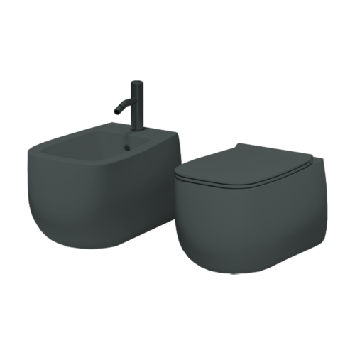 A line of wall-hung sanitary ware with rounded volumes. Rimless toilet bowl system, soft-close toilet seat cover.