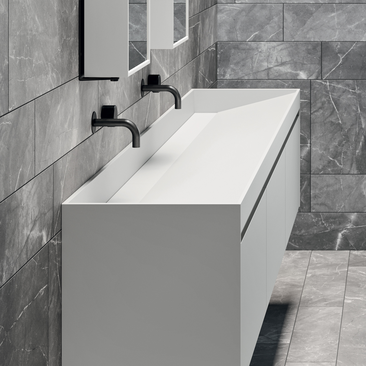 The Prime furniture is characterized by a structure entirely made of Corian® , providing a seamless and uniform appearance with no visible joints. The inspectable sliding basin, covering the entire length of the furniture, becomes the distinctive element. Various standard configurations are available in the catalog, or the composition can be custom-made to the centimeter to meet every project requirement.