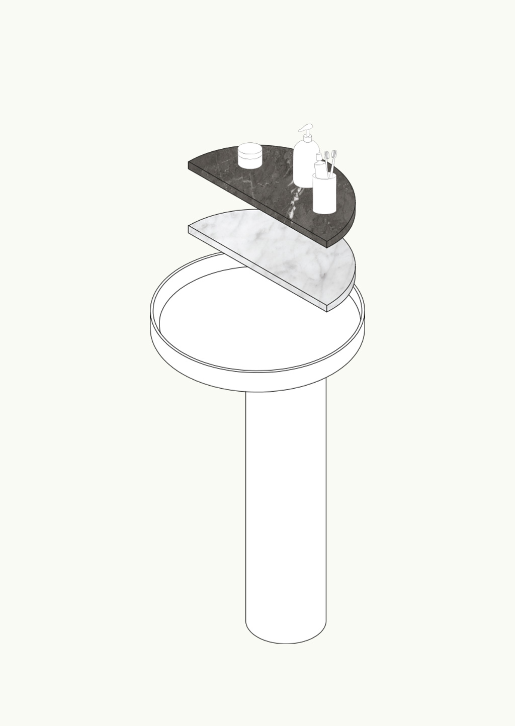 Il nostro obiettivo principale era progettare un lavabo in cui l'acqua scomparisse senza rivelare lo scarico, che solitamente non è la caratteristica più piacevole esteticamente. Abbiamo avuto l'idea di creare una vaschetta sospesa all'interno del lavabo per coprire appunto lo scarico che potesse anche servire anche come supporto per oggetti. In questo modo, sarebbe stato possibile lasciare sapone o altri articoli senza dover allontanare le mani dal lavabo, evitando così i tipici schizzi sul piano o sul pavimento. Da lì, abbiamo iniziato a lavorare sulla forma complessiva dell'oggetto, rendendolo gradualmente più leggero fino a ottenere un pezzo che rappresentasse l'epitome di funzionalità, estetica e leggerezza.