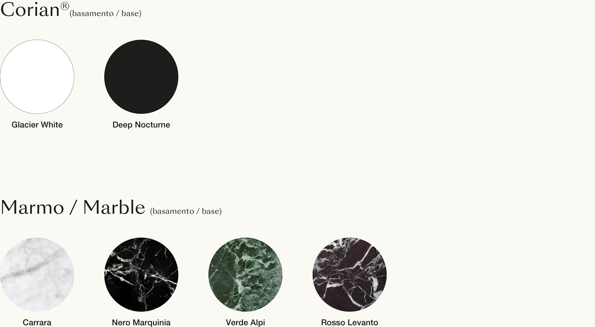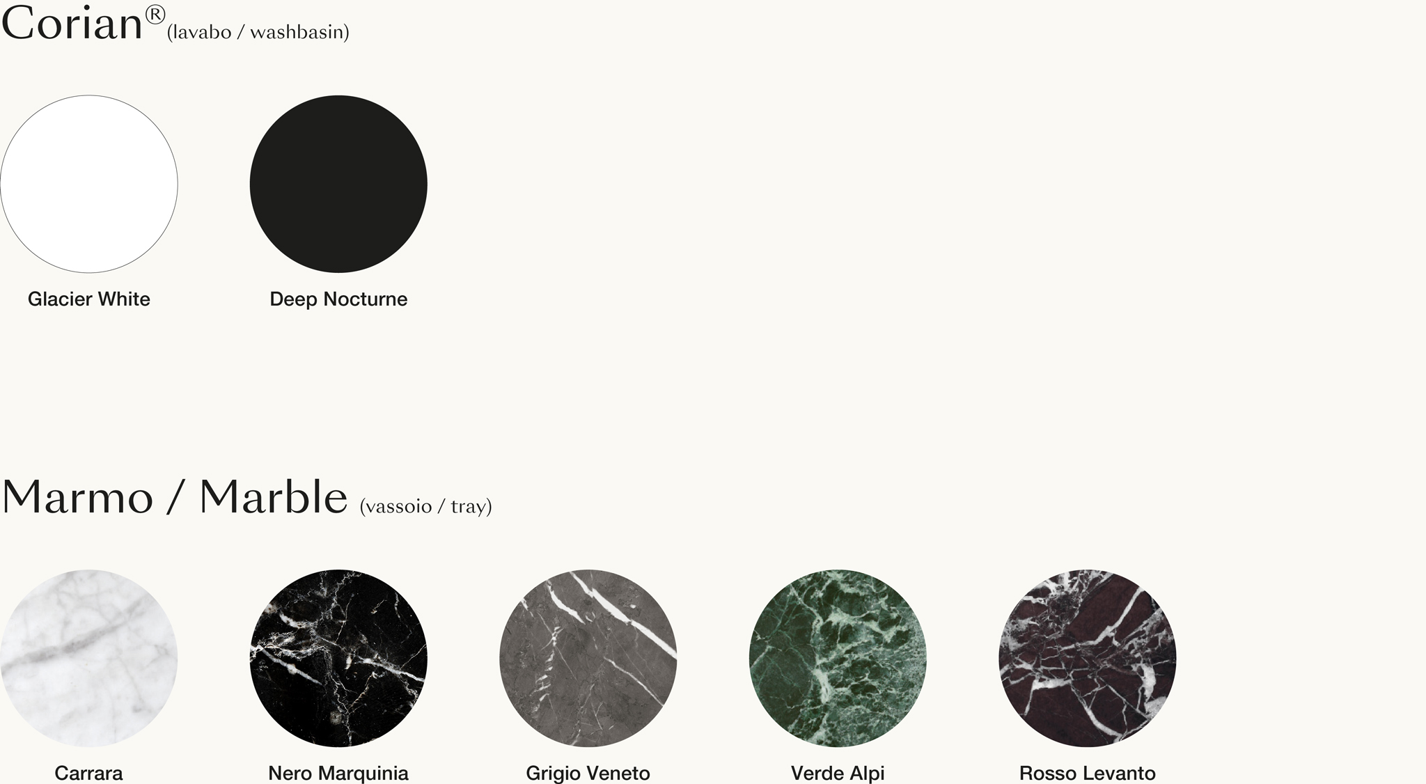 Il lavabo è realizzato in Corian® ed è dotato di un ripiano in Marmo removibile, che funge da appoggio e nasconde elegantemente lo scarico.