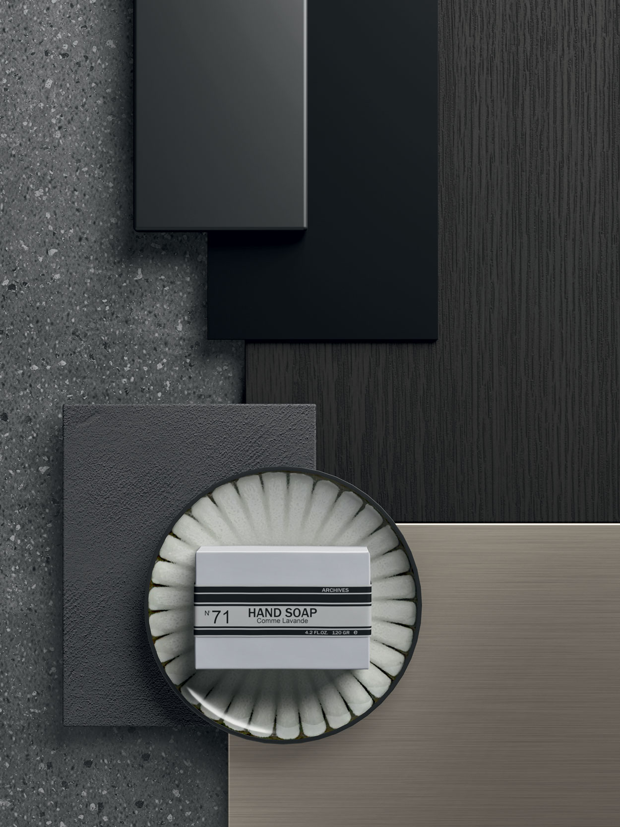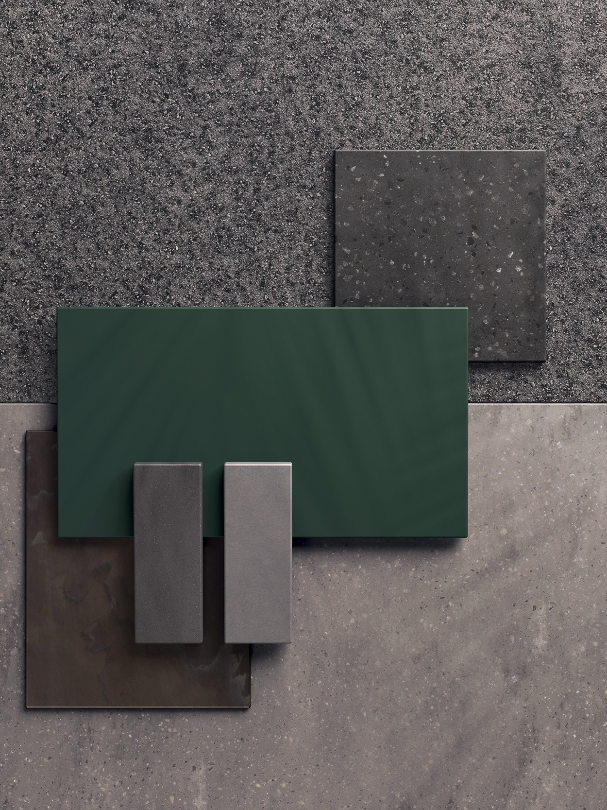 Corian® Ash Aggregate, Corian® Carbon Aggregate, Lamiera Materica, Laccato opaco Verde Pino, Corian® Carbon Concrete