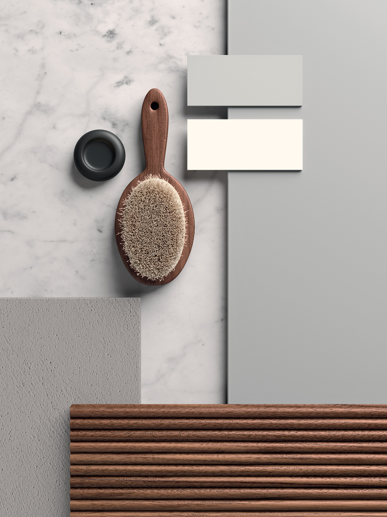 Marmo Carrara, Laccato opaco Grigio Luce, Fenix® Grigio Efeso, Fenix® Bianco Kos, Eco.malta Grigio Neutro, Legno Noce Cannettato