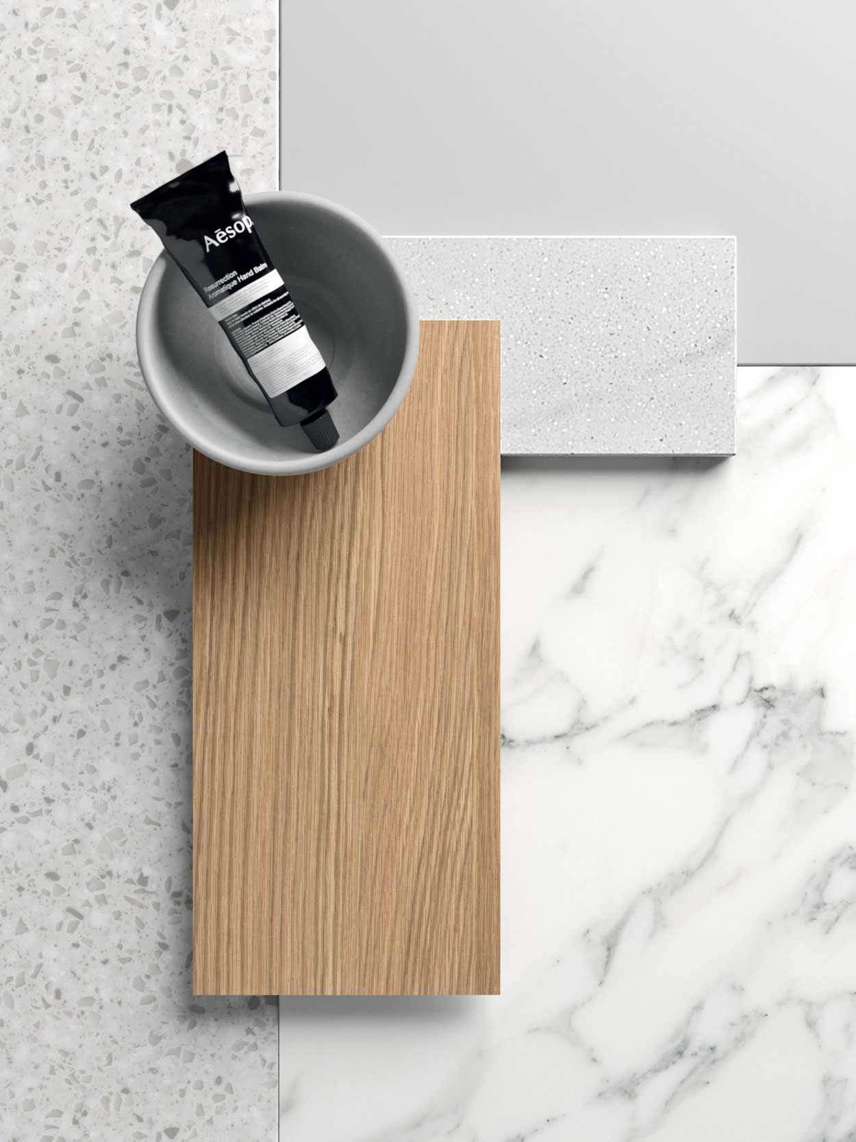 Corian® Silver Birch, Laccato opaco Grigio Pietra, Corian® Artista Grey, Rovere, Marmo Carrara