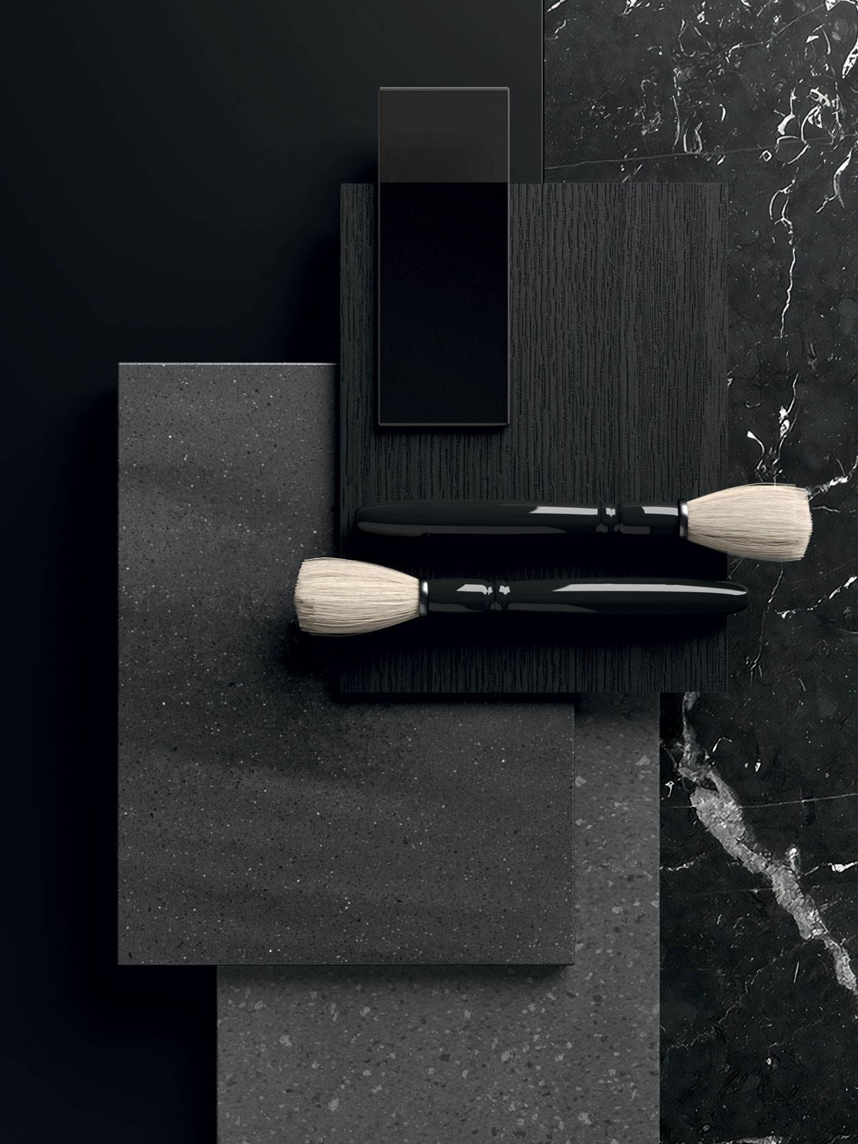 Laccato opaco Nero, Marmo Nero Marquinia, Vetro Grigio, Rovere Black, Corian® Carbon Concrete, Corian® Carbon Aggregate