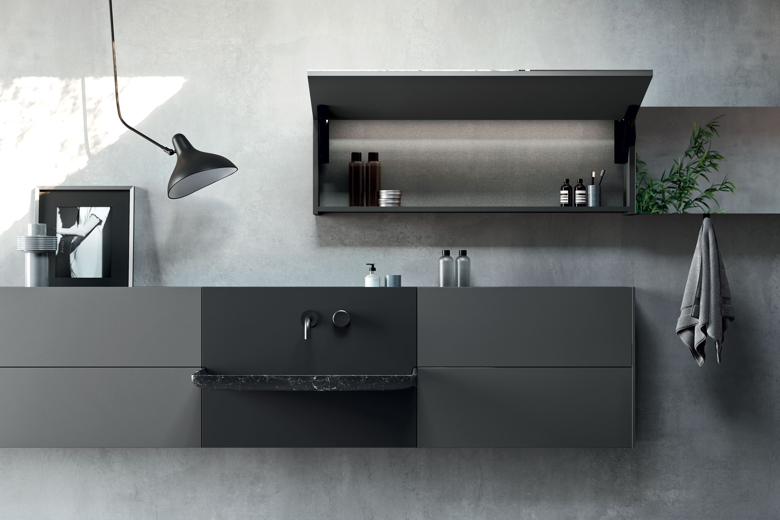 Forme essenziali arricchiscono la specchiera con una nota funzionale: un gancio portasalviette per la specchiera Vision.