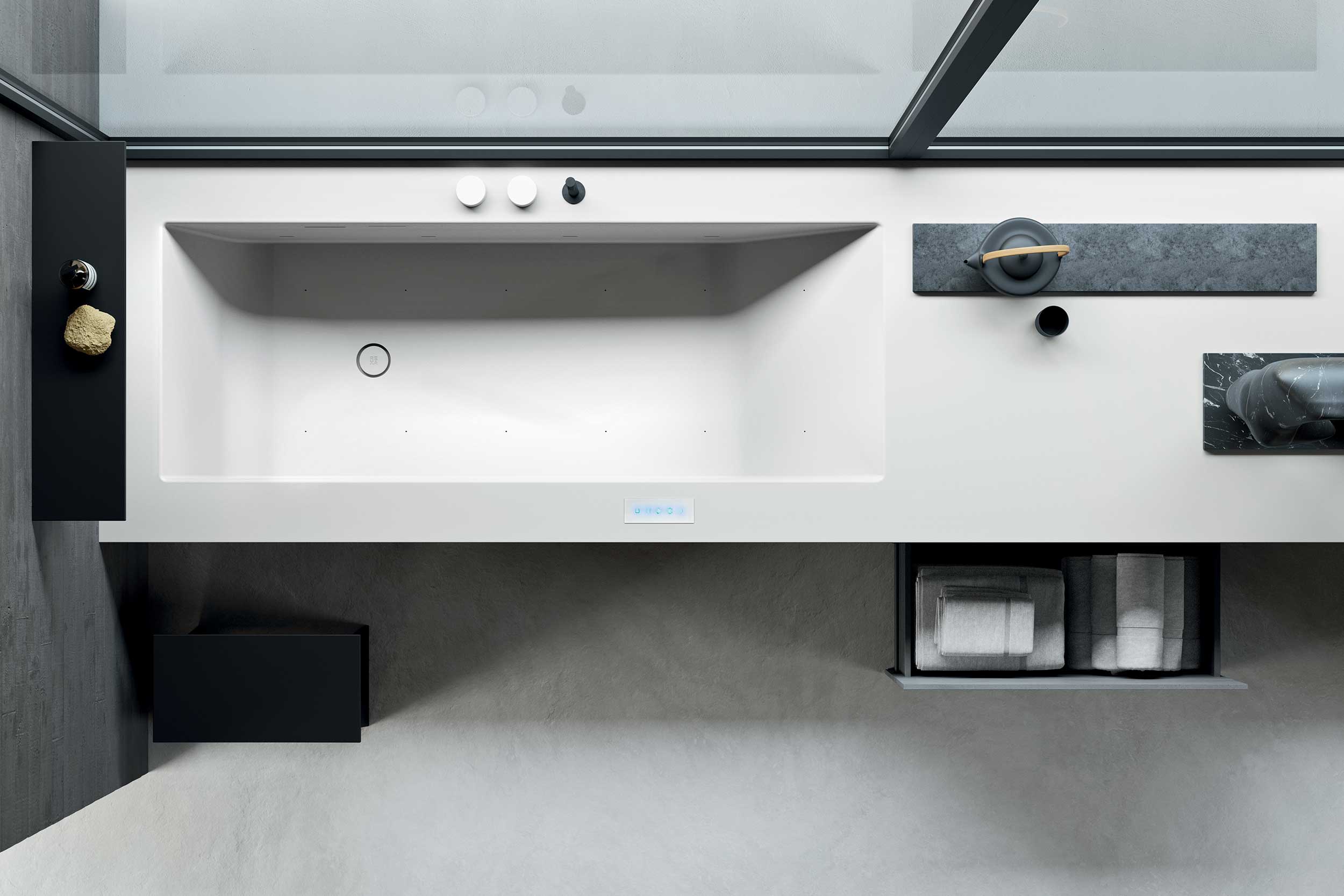 Una vasca da bagno che permette di giocare con ritmo e contrasto grazie alle contrapposizioni cromatiche definite da un’unione impercettibile di Corian® bianco, per gli interni, e del medesimo materiale a scelta fra 12 colori, per le pareti esterne. Disponibile anche nella versione con cassetto e impianti benessere.