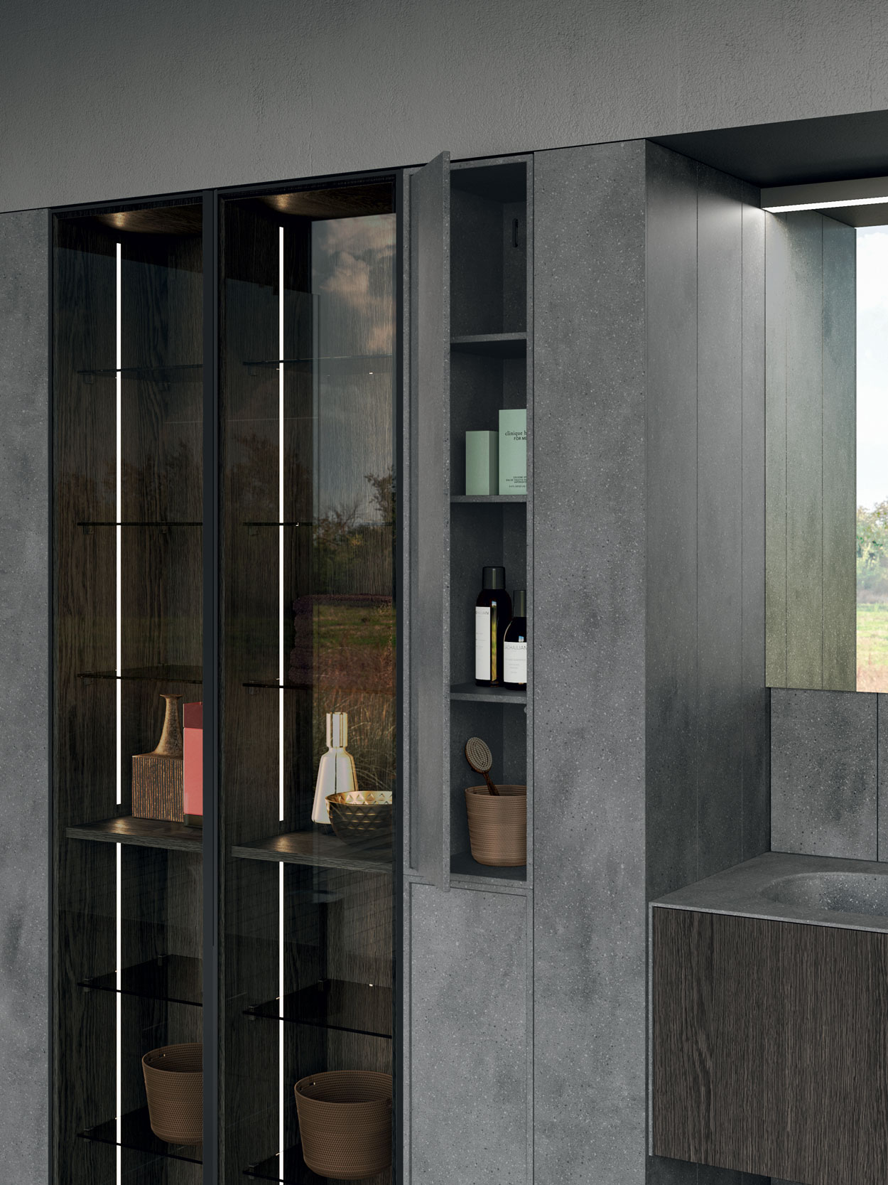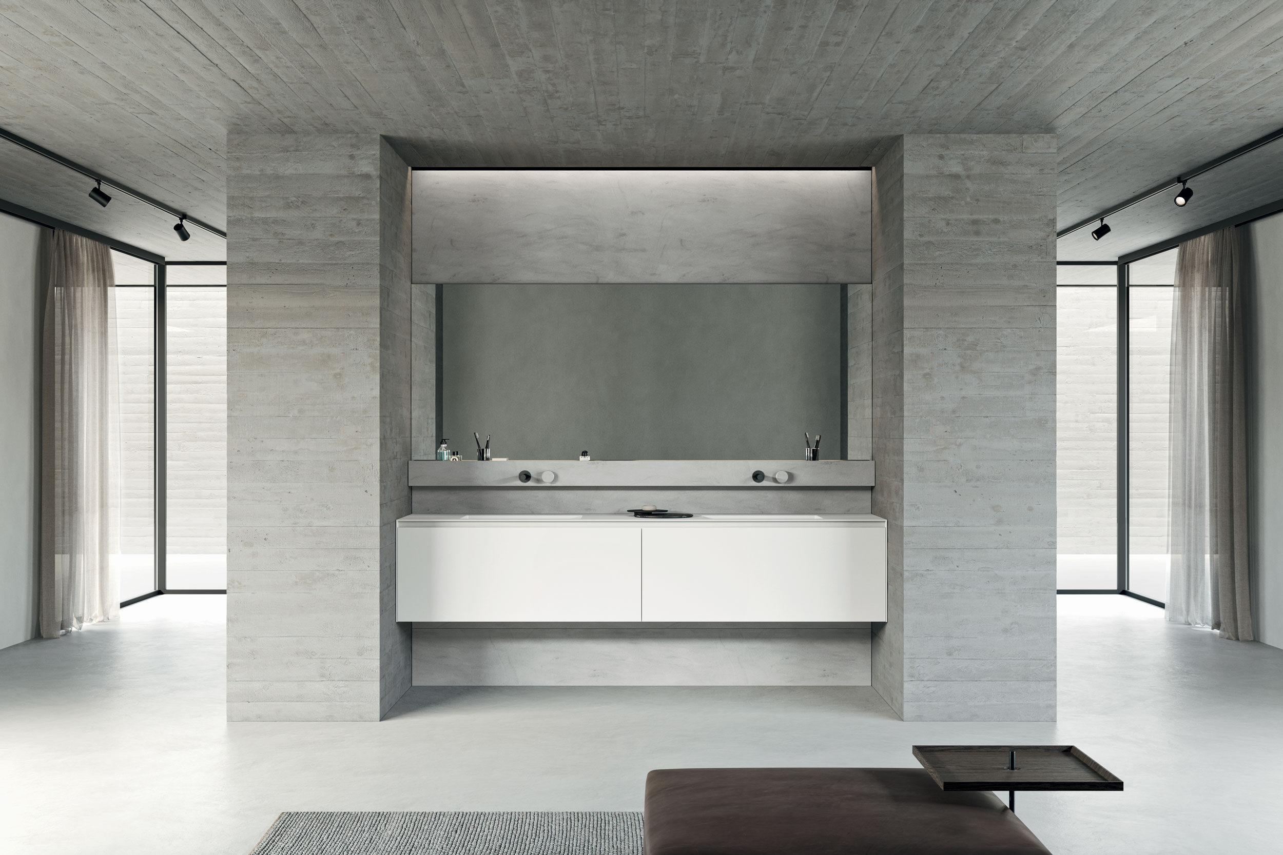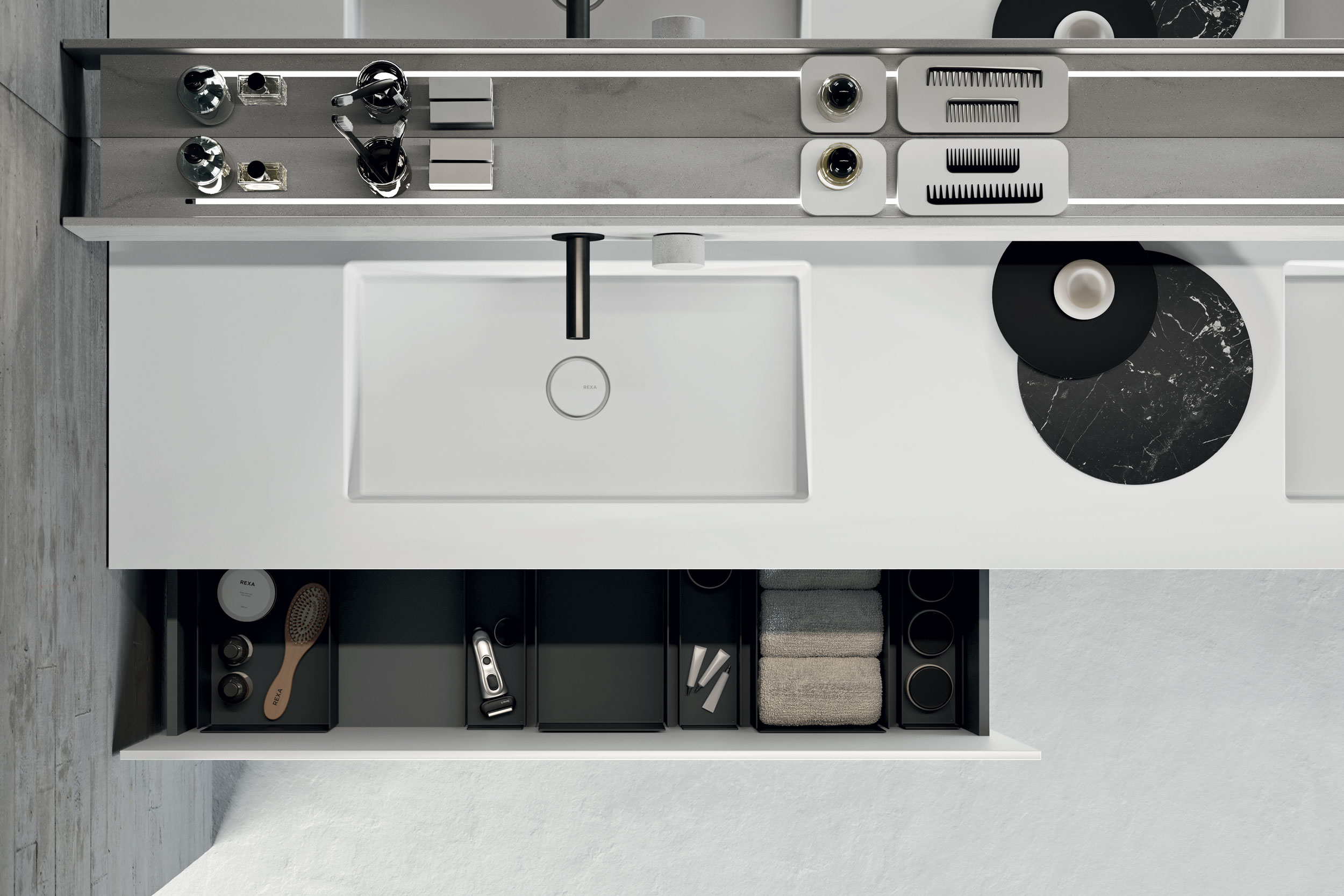 I mobili Ergo.23 sono caratterizzati da una struttura interamente realizzata in Corian® che offre un aspetto uniforme e senza giunzioni visibili. Top e fianchi sottili di spessore 6mm risultano un unico elemento e offrono la possibilità di combinare colori diversi rispetto ai frontali dei cassetti con gola, disponibili anche in legno. La collezione propone 4 tipologie di lavabo integrato e offre la possibilità di scegliere tra le configurazioni standard presenti a catalogo, oppure può essere realizzata su misura al centimetro per soddisfare ogni tipo di esigenza di progetto.
