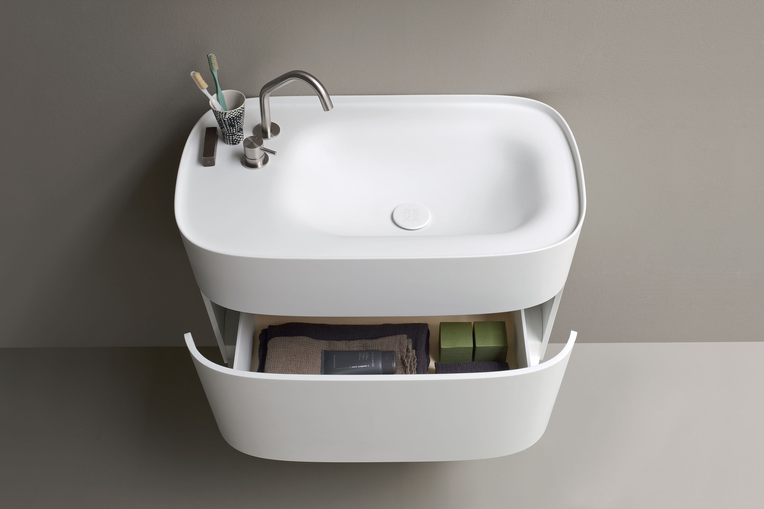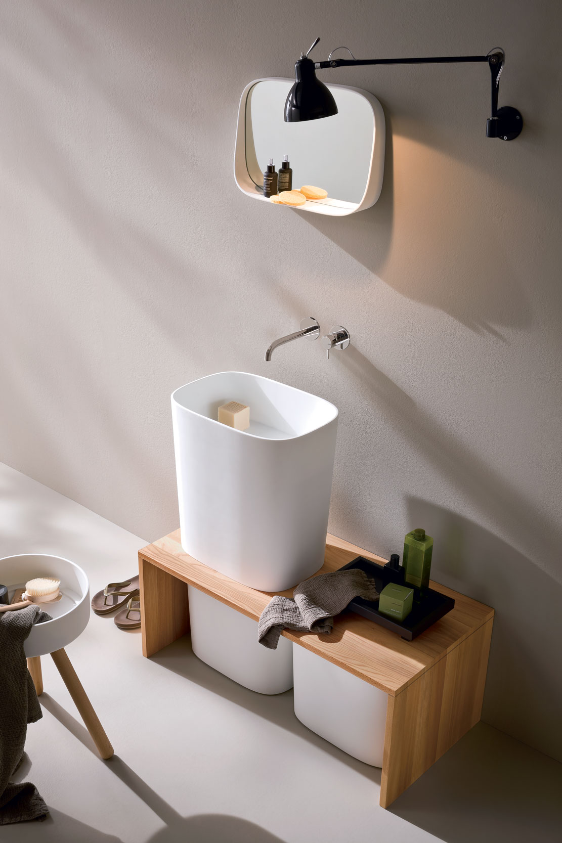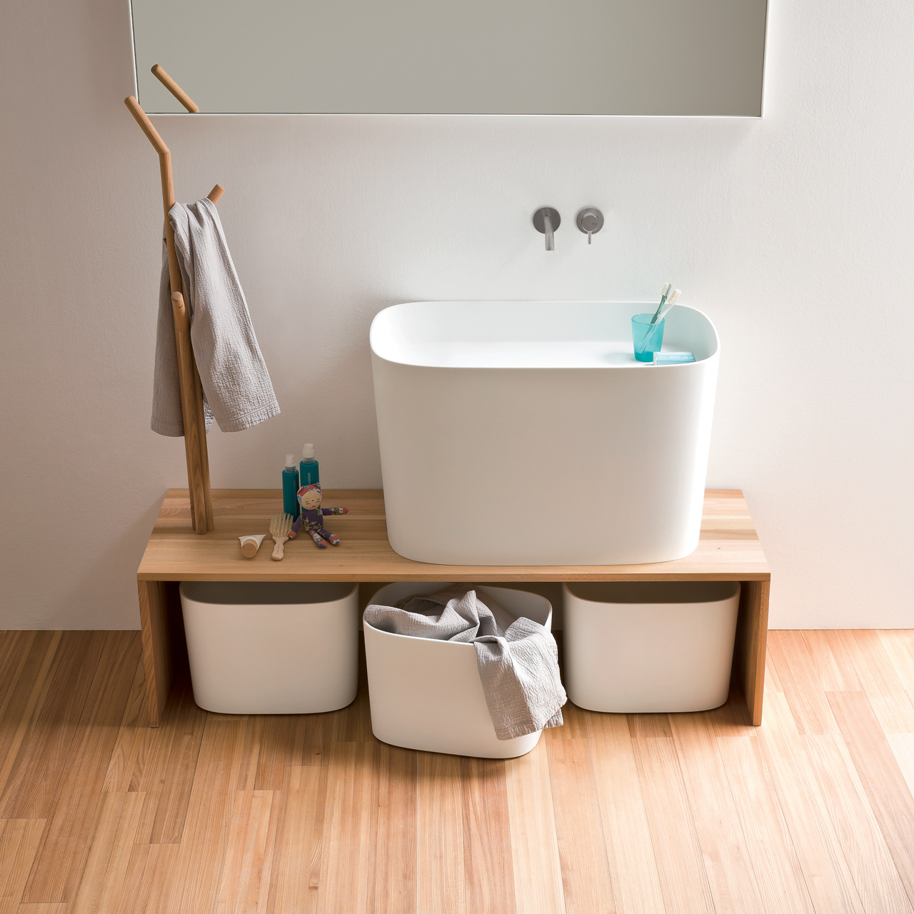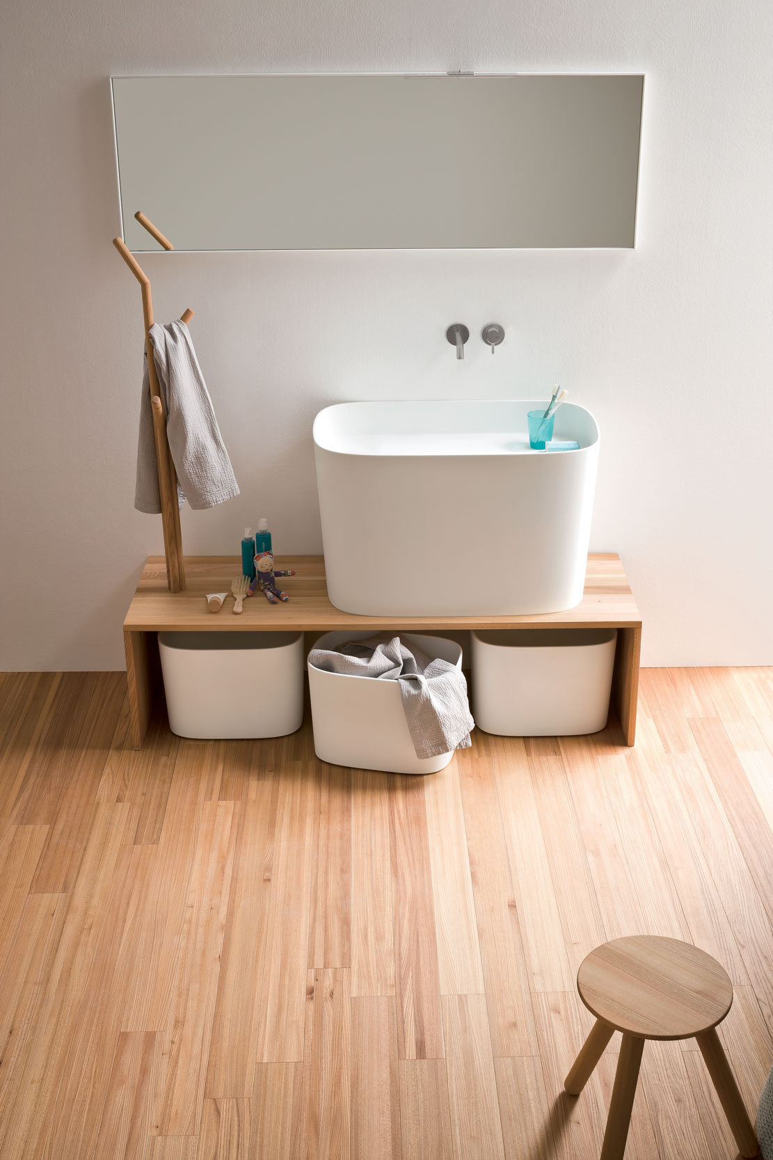 Fonte reinterpreta l’approccio orientale e il concetto di una stanza dedicata alla cura della persona come uno spazio da condividere con la famiglia. Un sistema di panche personalizzabili con accessori e lavabi in appoggio, sostituisce il più tradizionale mobile da bagno. Gli elementi iconici dalle forme morbide presenti in questo ambiente creano un’atmosfera rilassante e diventano gli unici protagonisti dello spazio. Questa semplicità si riflette anche nella scelta dei materiali dedicati: Corian® bianco e legno chiaro.