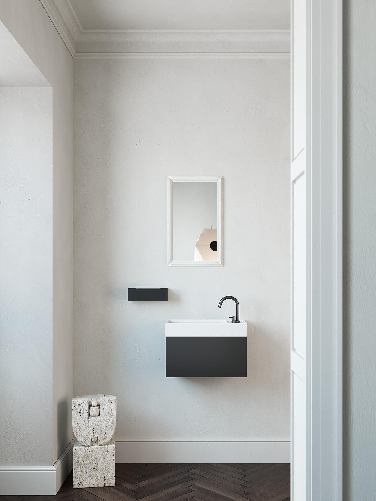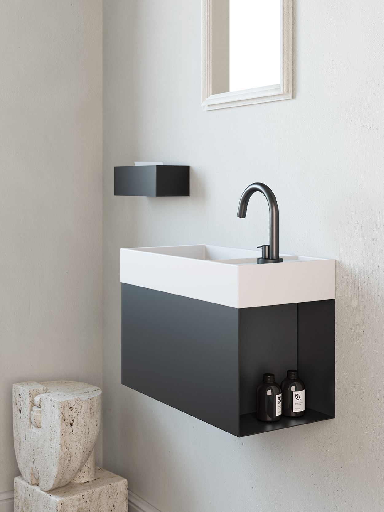 Lavamani bi-materico dotato di vano a giorno integrato e da una mensola d’appoggio laterale per riporre il necessarie per il bagno o per installare la rubinetteria direttamente sul lavabo.