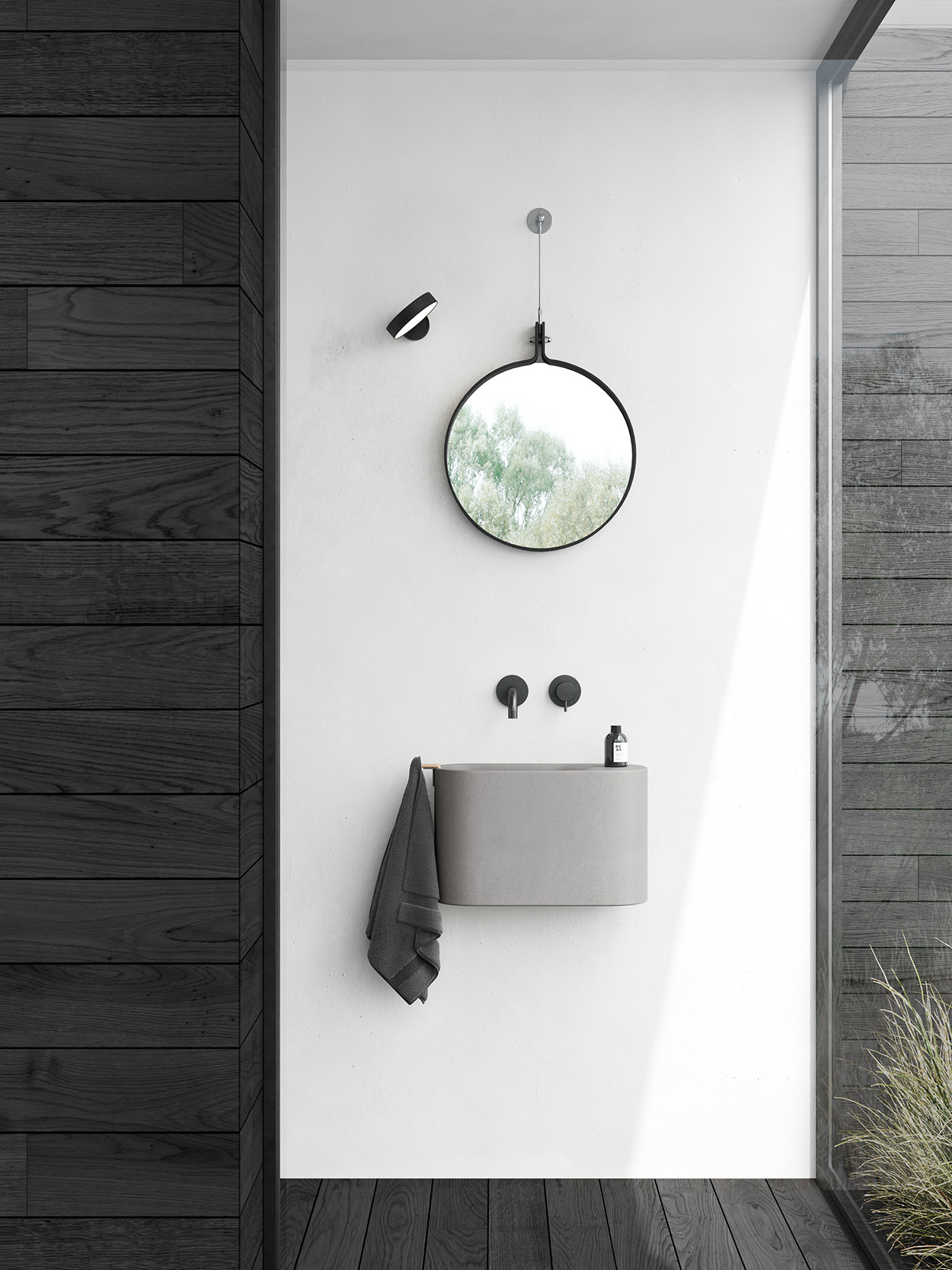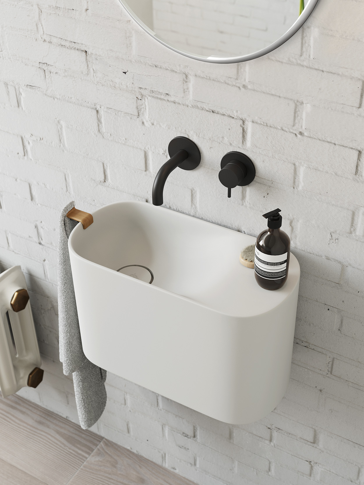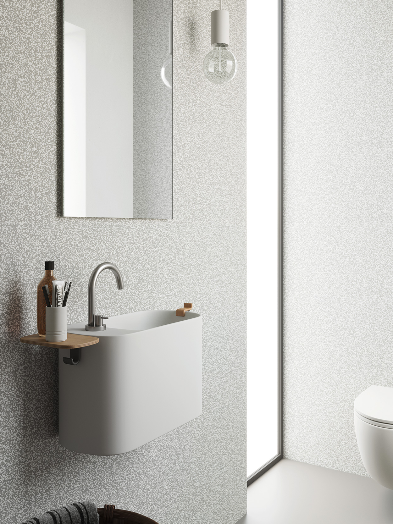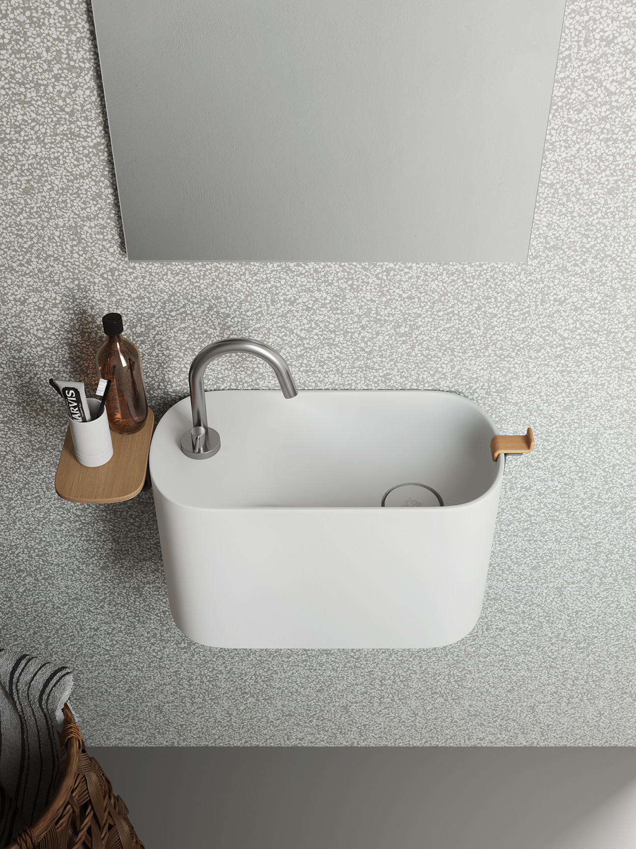 Lavamani compatto dalle linee morbide ed essenziali che sfrutta i bordi sottili per accogliere accessori in Faggio naturale quali il porta-asciugamano o la mensola, disponibile anche in Korakril™.