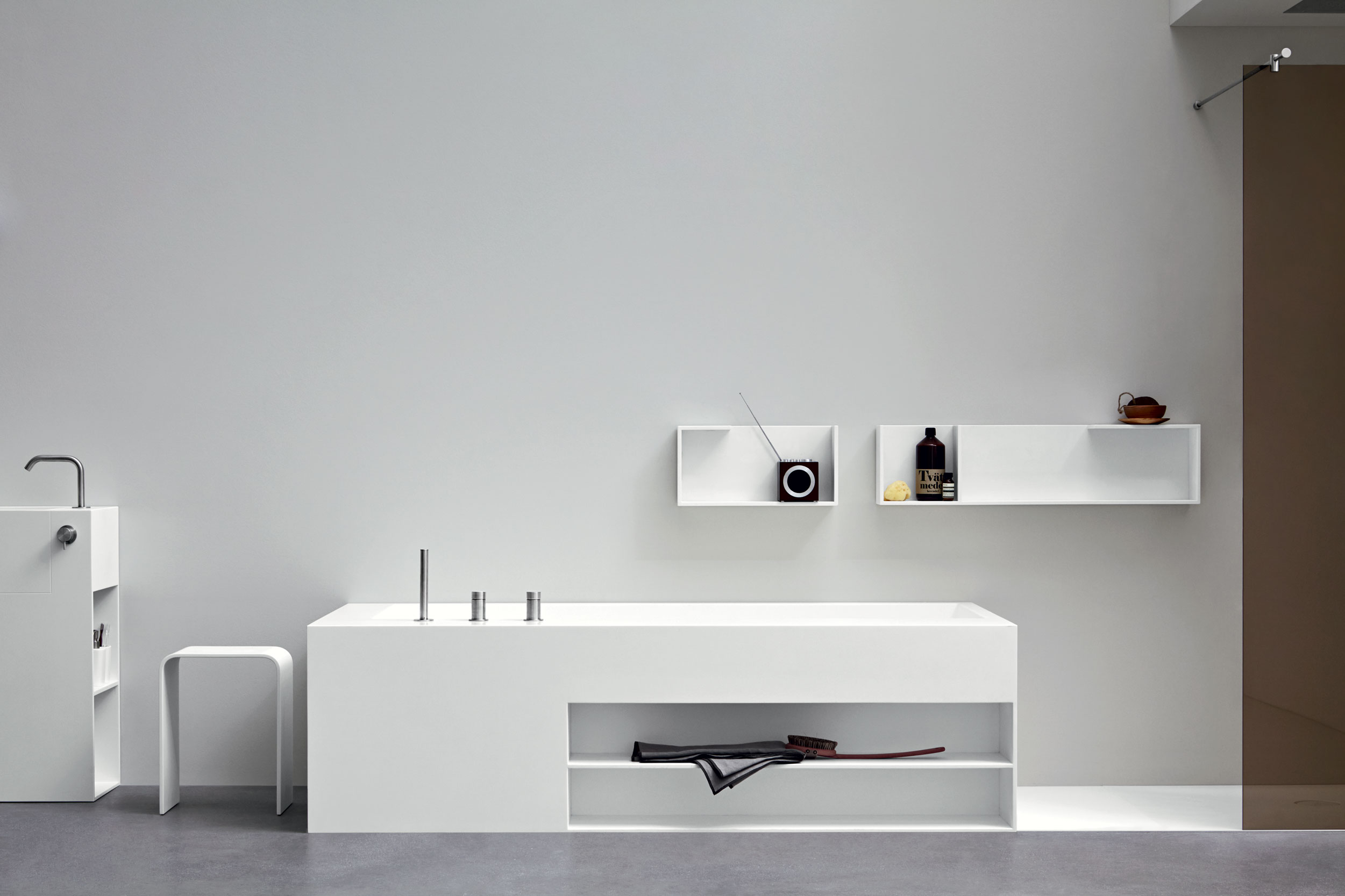 Stile e praticità in molteplici forme: orizzontali, verticali o con elemento a giorno. Le mensole Unico aggiungono contenimento alla stanza del benessere. Possono essere utilizzate anche all’interno di docce e vasche, a contatto con l’acqua. Realizzate in 12 finiture di Corian®, si integrano perfettamente con le composizioni della collezione e si completano con portasalviette, mensole e altri elementi modulari coordinati.