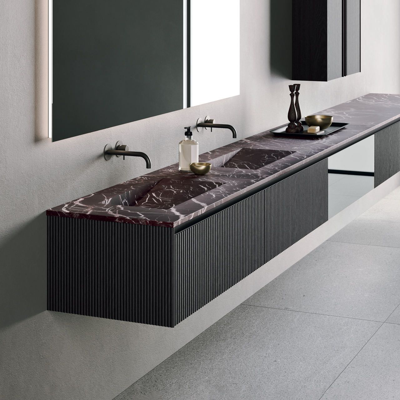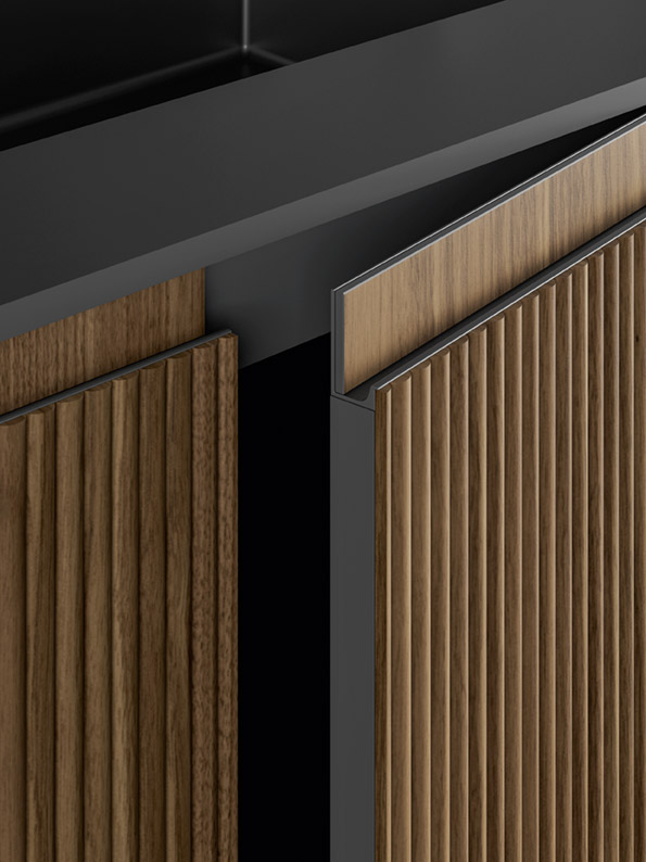 La collezione Moode propone la più vasta gamma di materiali e finiture, adatta a favorire ogni tipo di esigenza progettuale. La struttura dei mobili, disponibile in dimensioni standard oppure su misura, è arricchita da un telaio in alluminio nero che permette di personalizzare il rivestimento della composizione, mantenendo l’eleganza di spessori ultrasottili di ante e fianchi che delineano il profilo del mobile slanciandone l’estetica. Le diverse profondità di pensili e colonne offrono interessanti giochi di volumi, mentre gli elementi complementari ispiranti al mondo del living, come la boiserie in legno e metallo, scandiscono uno stile distinto e affascinante.