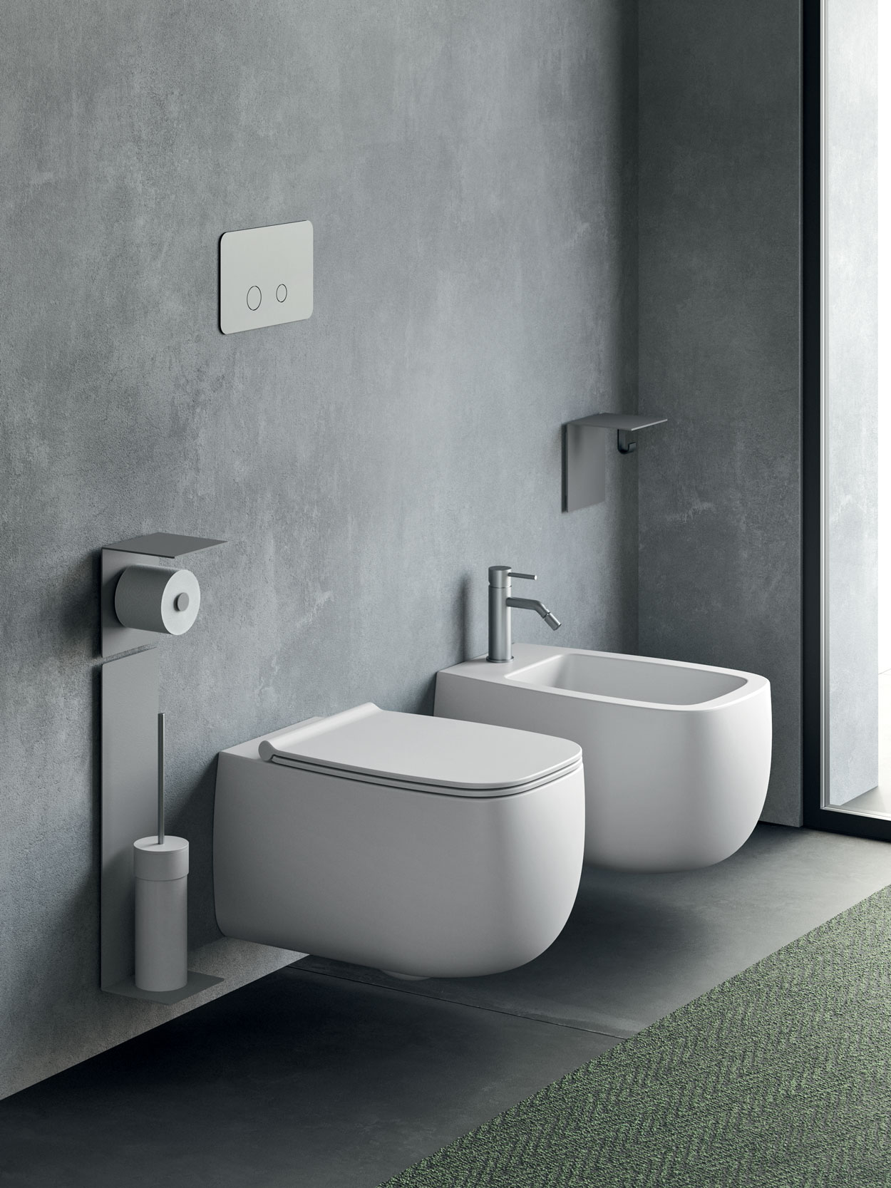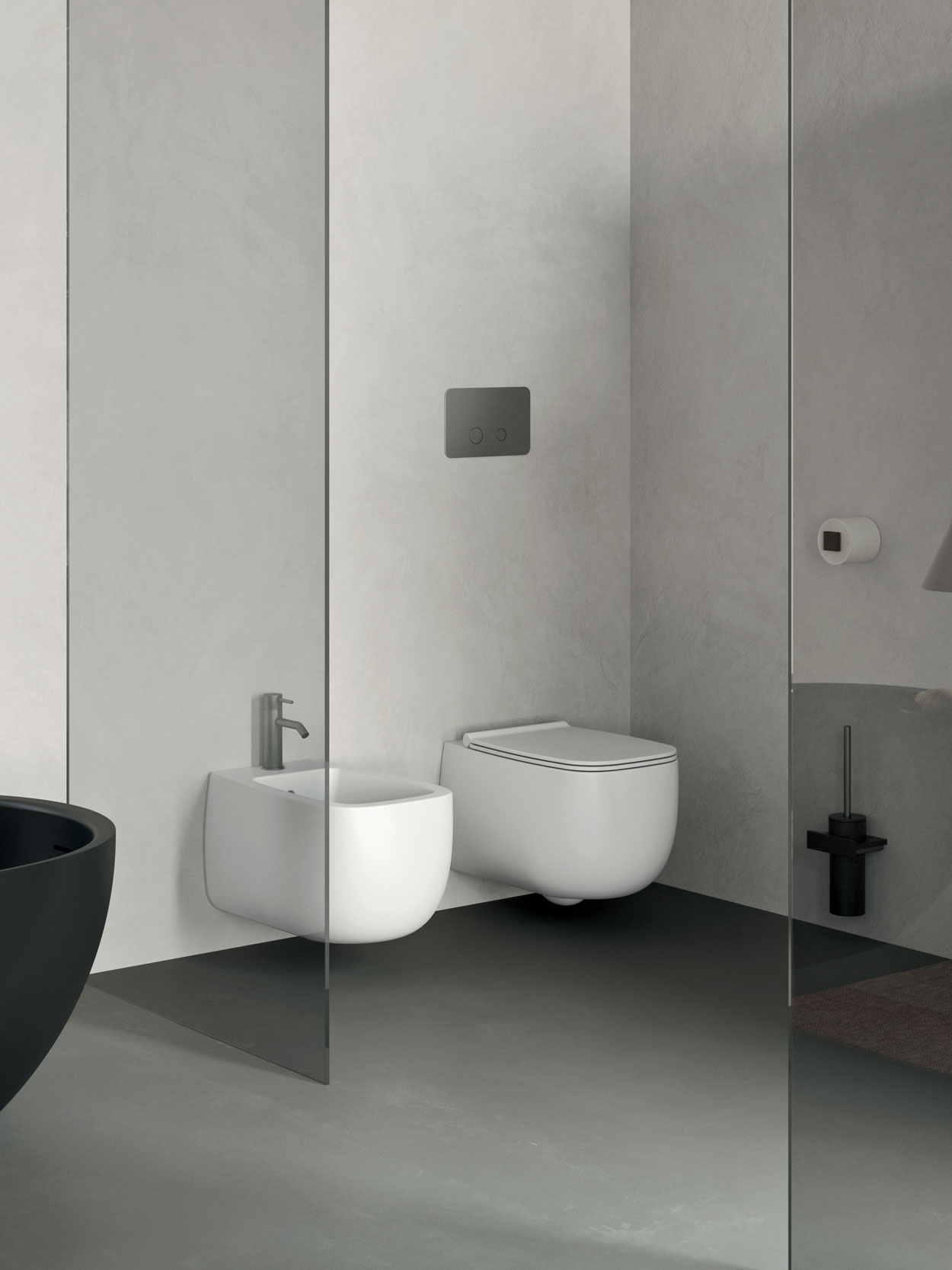 Una linea di sanitari sospesi dai volumi arrotondati. Vaso con sistema senza brida, coprivaso con chiusura soft-close.