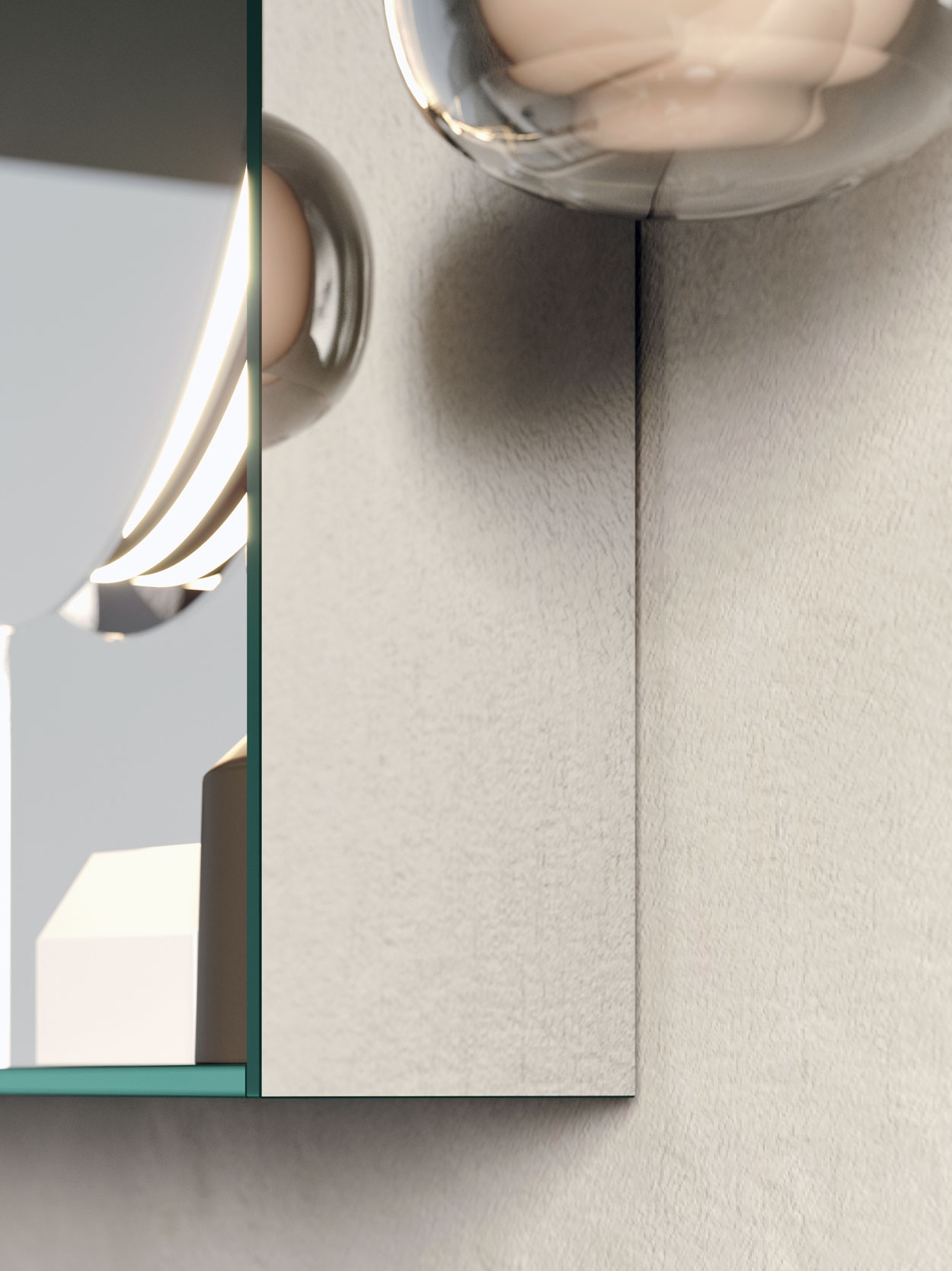 Una specchiera squadrata realizzata interamente in vetro: oltre alla funzione di mensola la cornice a specchio bifacciale permette la riflessione su entrambi i lati. Si presta ad abbinamenti con elementi contenitivi in Corian® o lamiera.