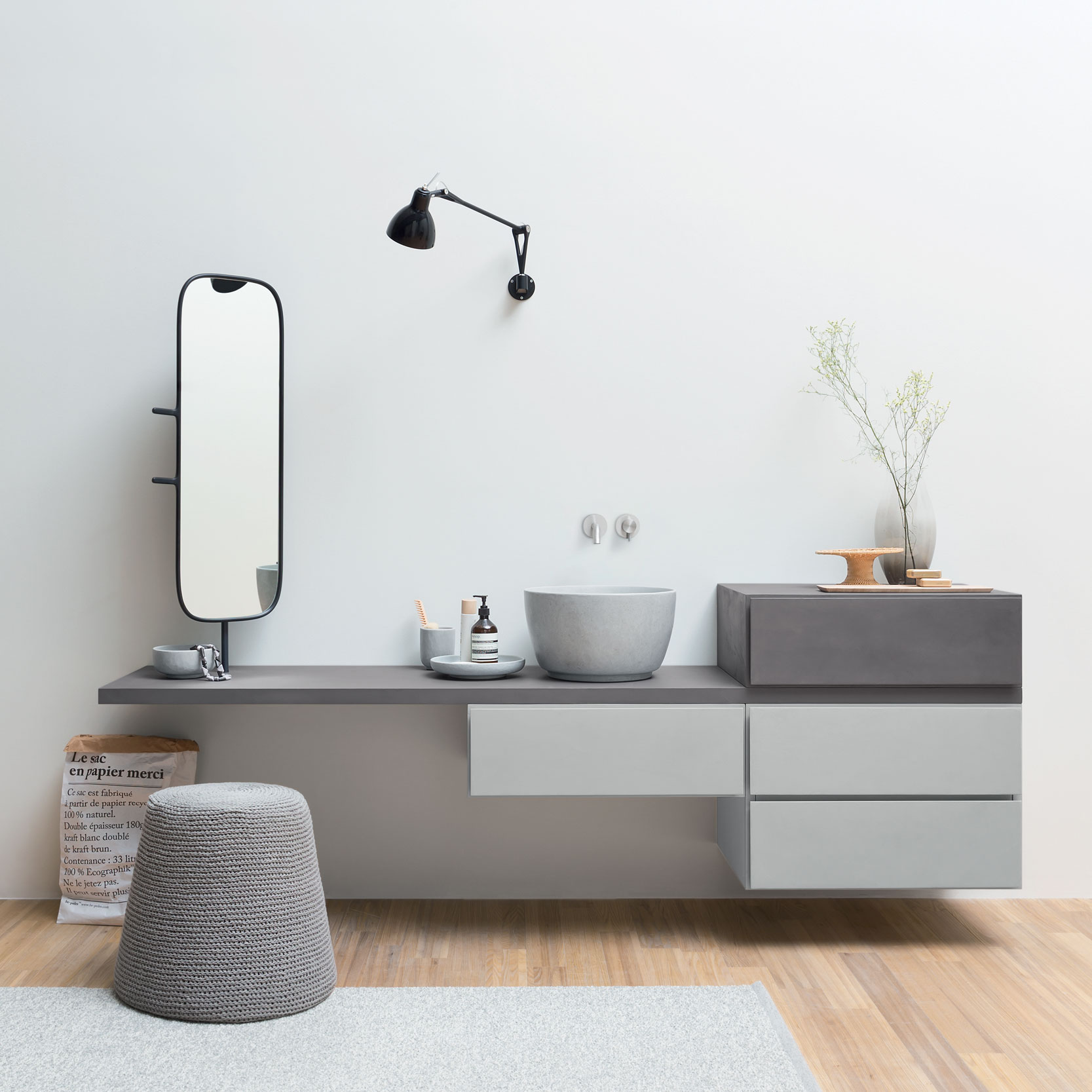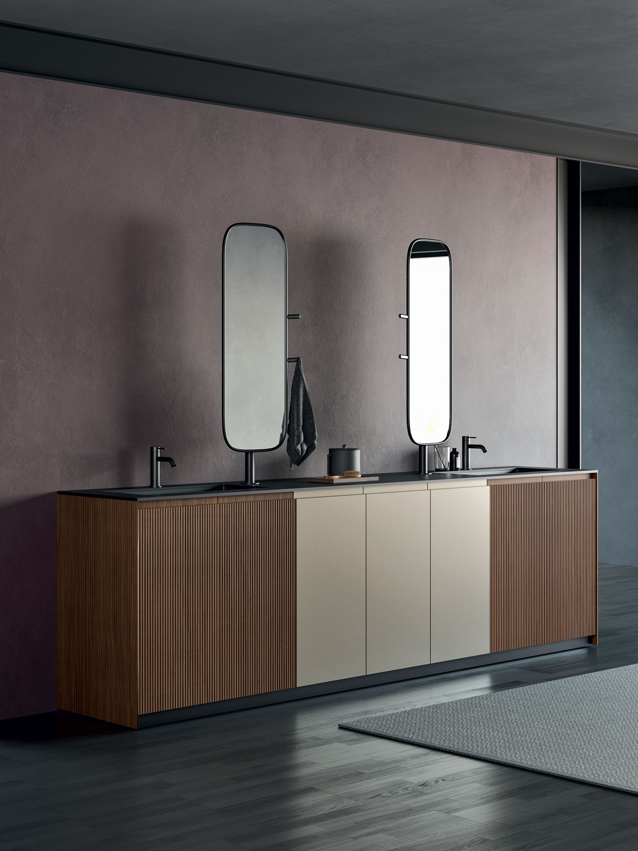 Esperanto è una specchiera con angoli arrotondati e cornice in Corian®, concepita per essere utilizzata anche da seduti, davanti ad una consolle dedicata alla cura della persona. Fissa o girevole, fissata sul piano, può essere dotata di pratiche appendici per appendere salviette, bracciali, collane.