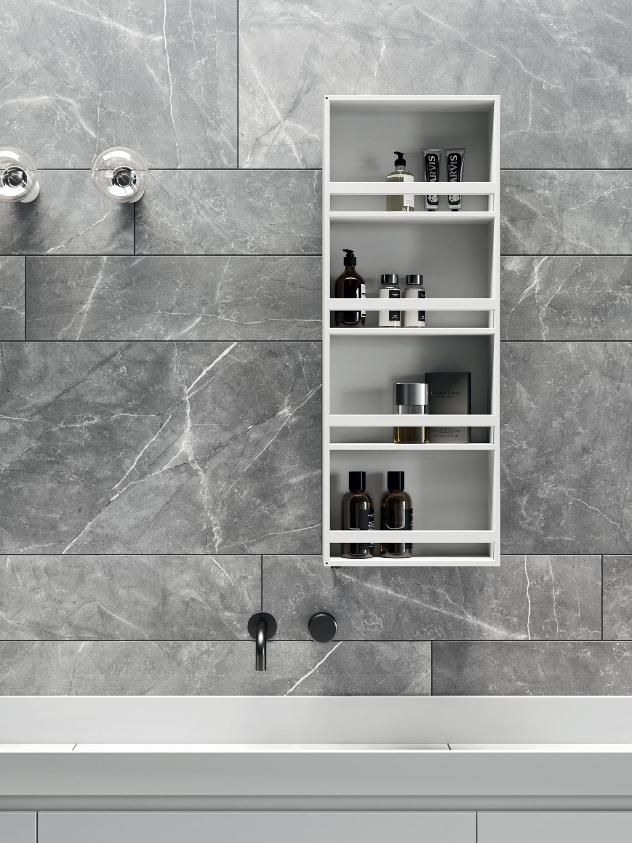 Una specchiera girevole in Corian®, ideale per ottimizzare gli spazi. Può ruotare di 180° attorno al perno di fissaggio a muro, svelando sul retro un vano organizzato con 4 ripiani dedicati agli accessori e agli oggetti per la cura di sé.