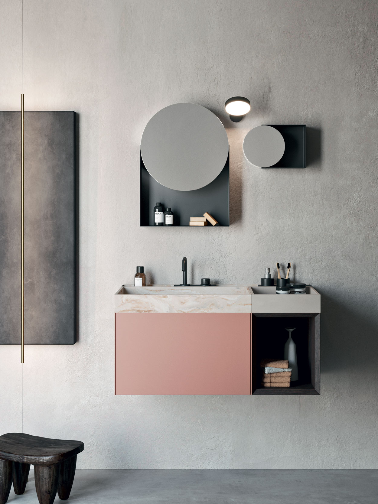 Uno specchio circolare avvolto da un lembo in acciaio lucidato a specchio, che è perfettamente integrato nella cornice e funge da mensola, completando così il design con un’armoniosa combinazione di linee, materiali e varianti di colore. È disponibile in due dimensioni: la più piccola è uno specchio ingranditore. Entrambe possono essere installate verticalmente con un vano nella parte inferiore od orizzontalmente con un vano laterale.