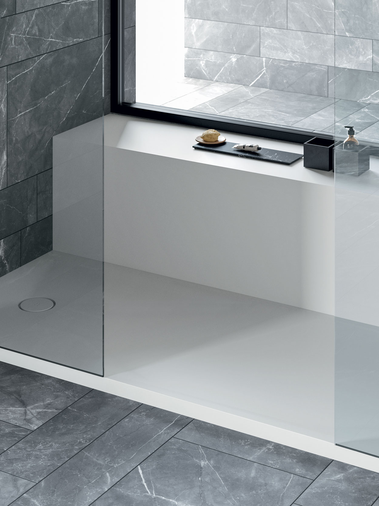 Un piatto doccia in Corian® dal design essenziale con copripiletta a filo, nello stesso materiale. Disponibile in dimensioni personalizzate al millimetro per gestire angoli fuori squadra o per definire il posizionamento esatto della piletta, in base alle esigenze del progetto. Unico è il programma che permette di conferire continuità estetica all’ambiente bagno grazie alla combinazione di rivestimenti e altri elementi d’arredo personalizzabili in Corian®, materiale che garantisce massima igiene certificata da LGA Hygiene Tested, facilità di pulizia e proprietà antiscivolo.