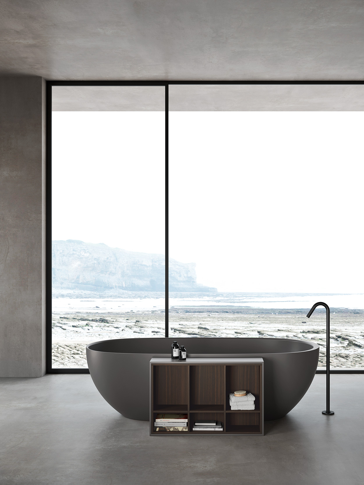 Hole con libreria è ideale per riporre volumi, oggetti da bagno ed altri accessori. L’utilizzo del legno, dall’impatto caldo e senza tempo, si fonde armonicamente con il Korakril™. La libreria può essere integrata nella versione centro stanza o con muretto; la composizione si completa con il sistema airpool per vivere il bagno come un luogo di assoluto relax.