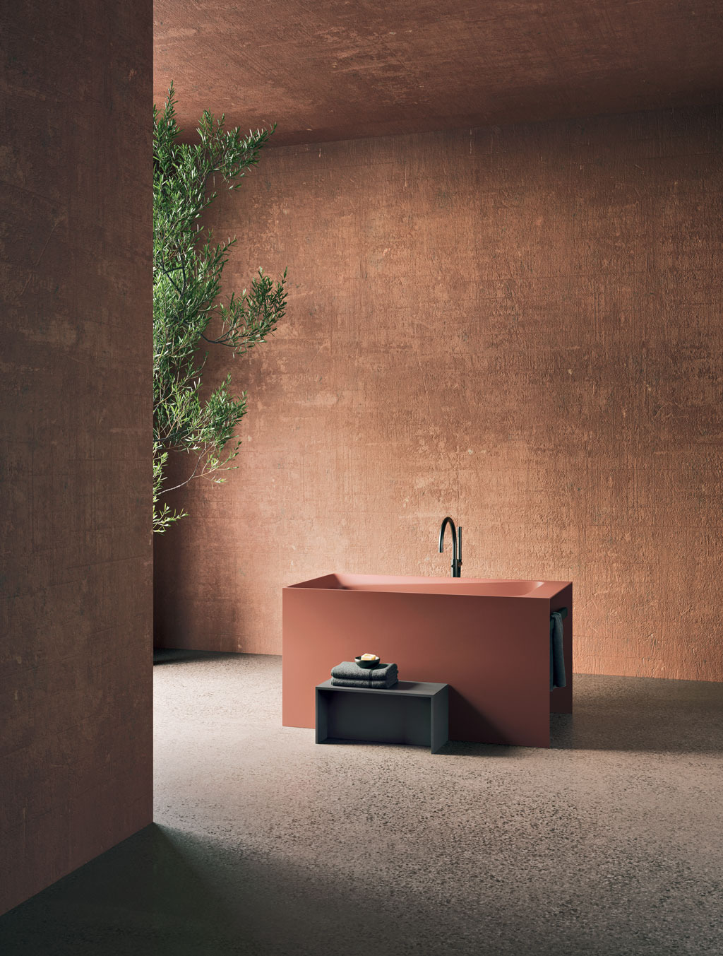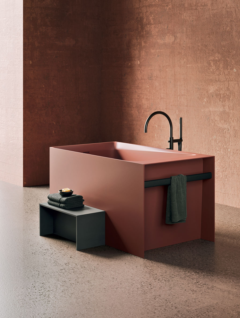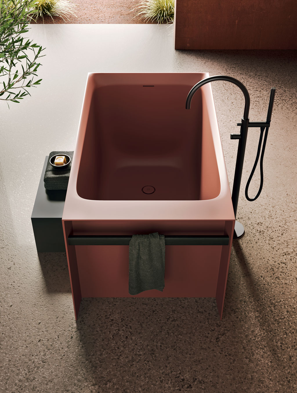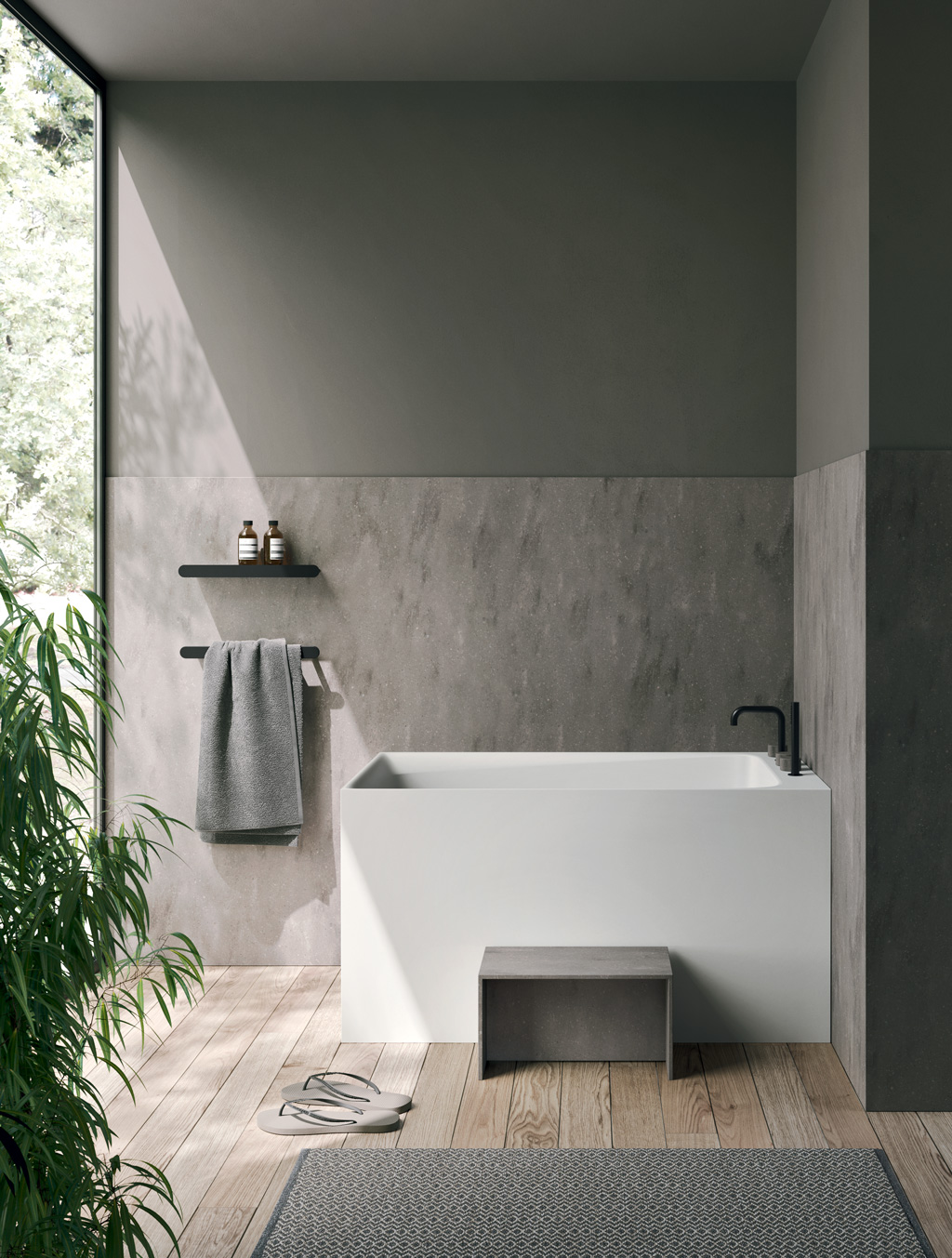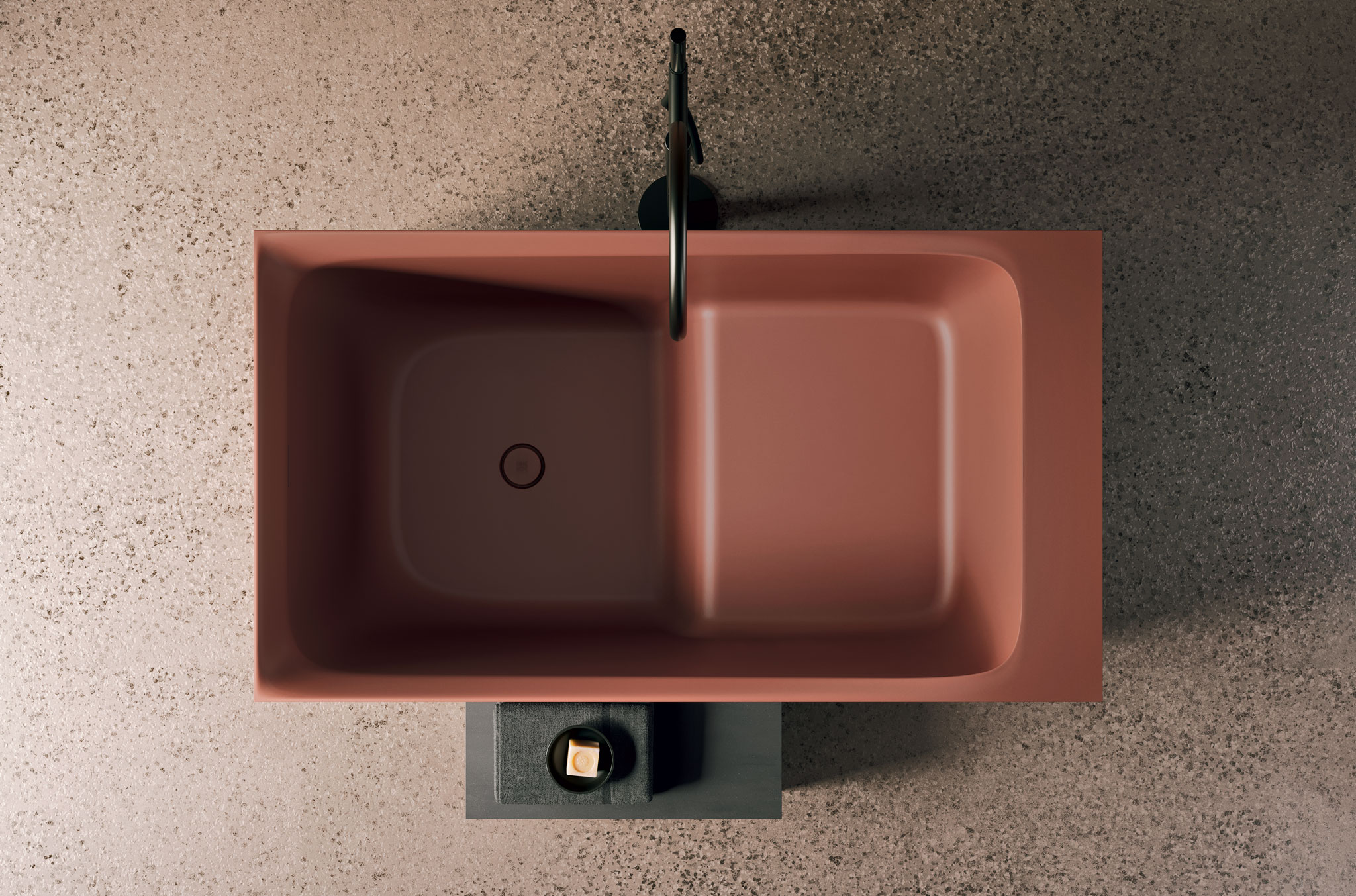 Una vasca ad immersione, dall’aspetto secco e asciutto, ammorbidito da un bordo fluido e sagomato. Può essere utilizzata in spazi piccoli, affiancata a muro, messa in angolo o in centro stanza.