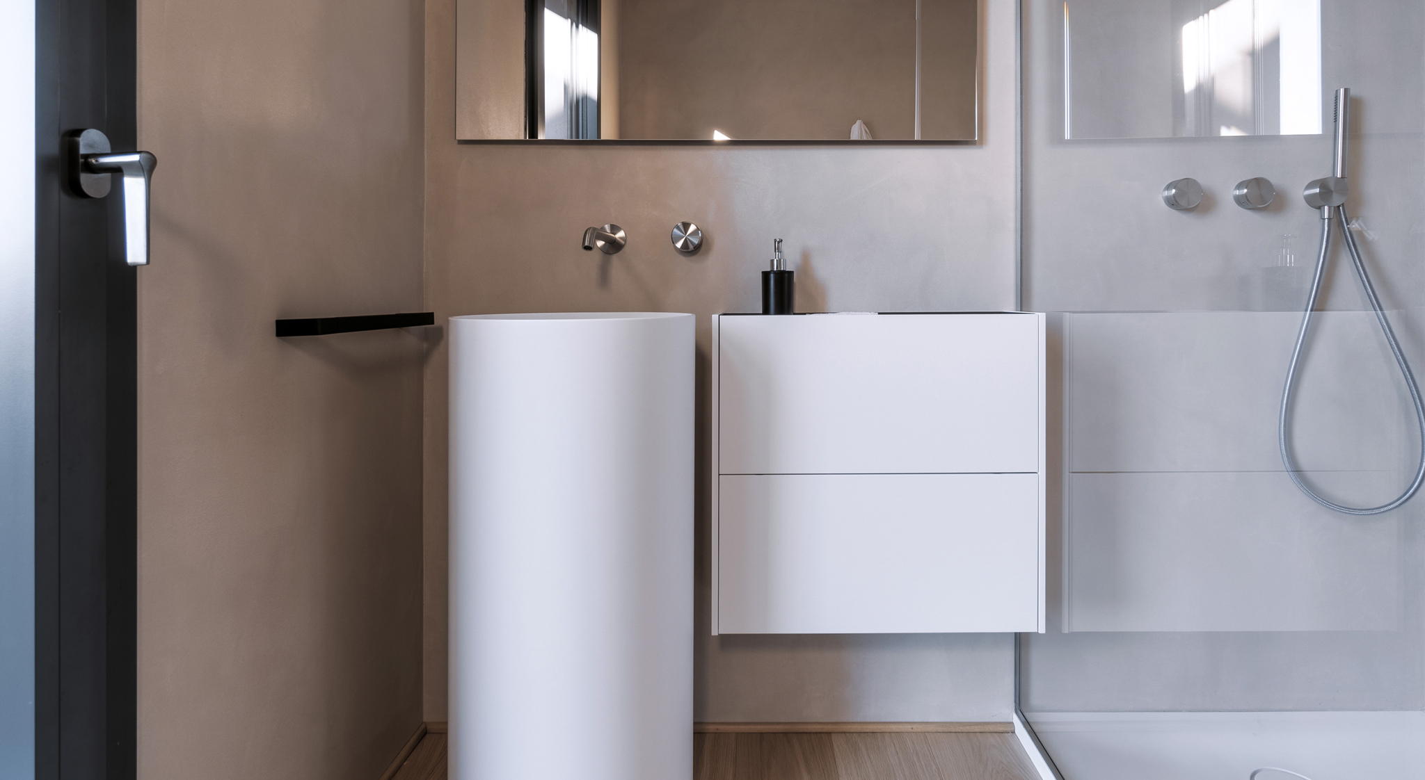 Il bagno di servizio si caratterizza per un'estetica raffinata e contemporanea. Il lavabo a terra Rotondo si fonde con eleganza a Vision, un mobile di profondità ridotta, realizzato nella stessa finitura di Corian®, che aggiunge contenimento e piano d’appoggio per gli accessori. La stessa finitura si estende al piatto doccia Unico, completando l'insieme nel rispetto della continuità materica di progetto.