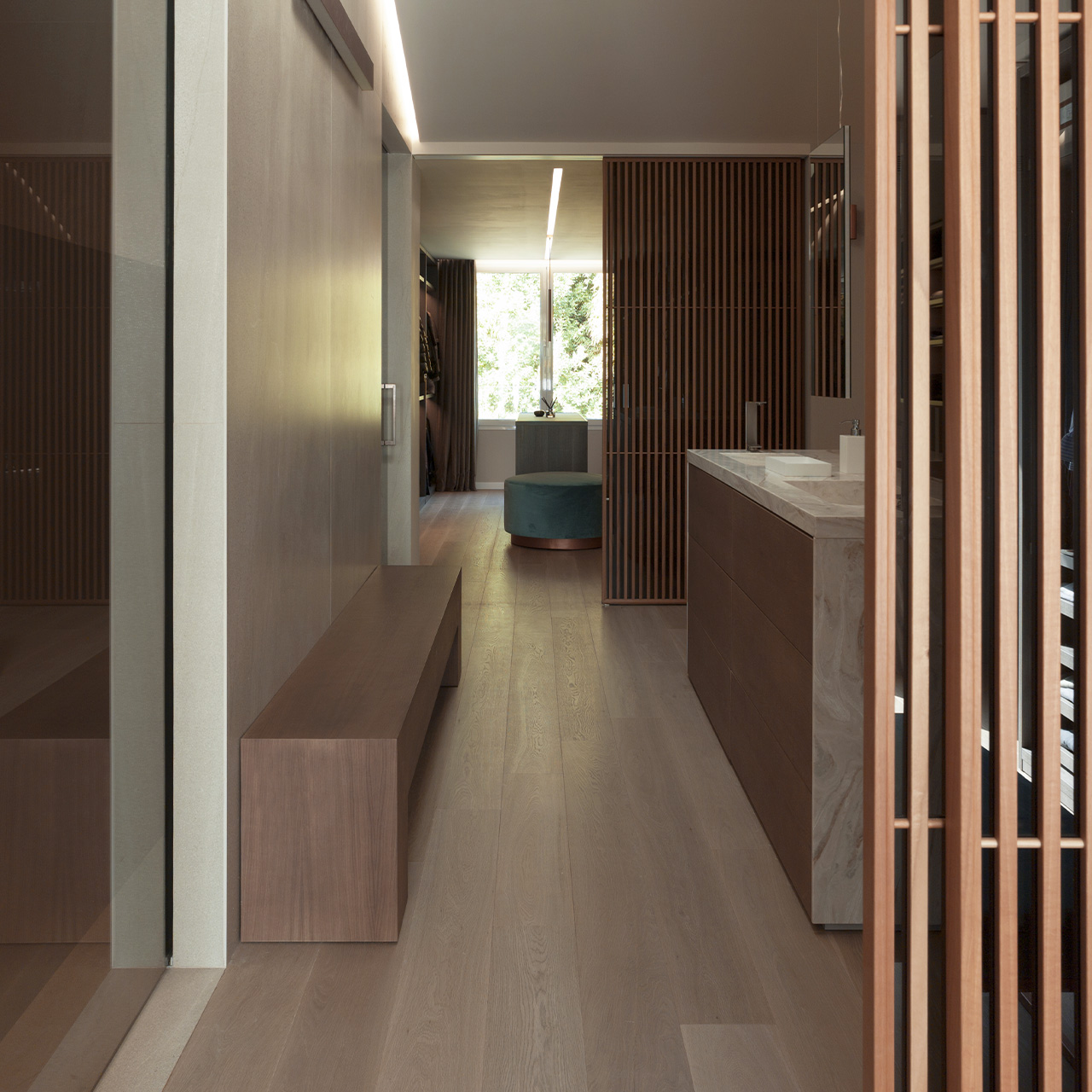 Per armonizzare le peculiarità di ciascun ambiente con le esigenze dei singoli clienti, è imprescindibile condurre uno studio dettagliato su elementi personalizzati. A Valencia, per questa residenza, Rexa ha collaborato a stretto contatto con il rivenditore El Picaporte e lo studio di architettura Hernandez Arquitectos per creare un'isola all'interno della stanza da bagno multifunzionale e su misura che integra top, lavabo, consolle trucco e contenimento. Questo progetto si distingue per l'esclusivo mix di Corian® Dune Prima e Rovere, presentato in una tonalità appositamente concepita per questa realizzazione.